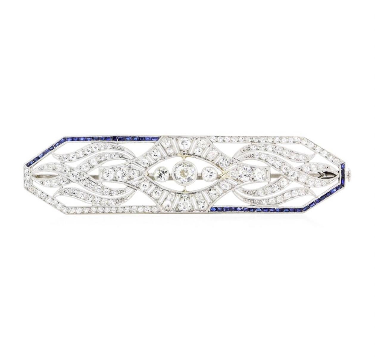 One electronically tested platinum ladies cast & assembled diamond and sapphire brooch. The brooch is completed by a horizontally placed pin. Bright polish finish with milgrain detailing throughout. Area measurements 2.75 x 0.62 inches. The brooch is reminiscent of the jewelry designs from the Art Deco Period. The Paris Exposition of Decorative Arts and Modern Manufacturers in 1925 gave the movement its name. The Art Deco Period is characterized with jewelry designs composed of bold geometric designs, & cubism. Condition is good. Containing: One bezel set Old European cut diamond, measuring 4.70 - 4.60 x 2.35mm (depth est.) approximate weight of 0.35ct. Cutting style circa early 20th century. Graded in the setting. Clarity: SI-2. Color: H Eight bezel and bead set Old European cut diamonds, measuring 2.80 - 2.60 x 1.67mm (depth est.) approximate total weight of 8 Stones = 0.69ct. Cutting style circa late 19th century. Graded in the setting. Clarity: VS-2 to SI-1. Color: H - I One Hundred Twenty bead set Old European and Single cut diamonds, measuring 1.70 x 1.30 x 0.93mm (depth est.) approximate total weight of 120 Stones = 1.62ct. Cutting style circa early and late 19th century. Graded in the setting. Clarity: SI-1 to I-1. Color: G - I Forty-eight channel set rectangular step cut natural blue sapphires, measuring 1.60 x 1.20 x 0.78mm, approximate total weight of 1.00ct., clarity is slightly included, type II, medium dark, very slightly grayish, violetish blue color, (GIA vB 6/3), cut is good. Transmitting light with a minimum of distortion, transparent. Naturally occurring internal & external characteristics are present. Measurements & the color grade are an average for the group. Graded in the setting. Total Weight of Colored Stones 1.00ct. Total Weight of Diamonds 2.66ct. Total Weight of Brooch 12.30 grams. AIG Appraised at $12,275.00.