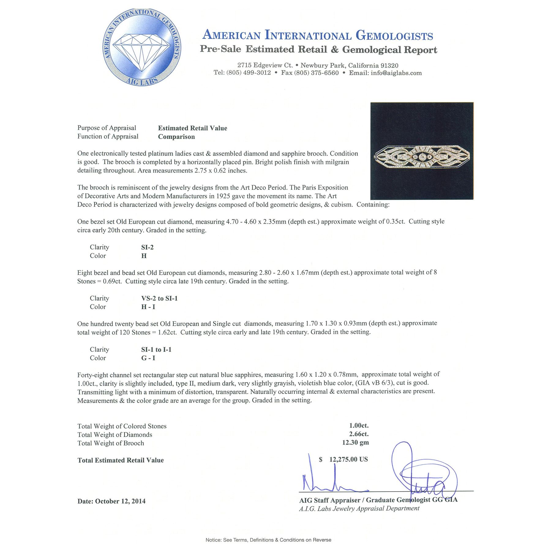 One electronically tested platinum ladies cast & assembled diamond and sapphire brooch. The brooch is completed by a horizontally placed pin. Bright polish finish with milgrain detailing throughout. Area measurements 2.75 x 0.62 inches. The brooch is reminiscent of the jewelry designs from the Art Deco Period. The Paris Exposition of Decorative Arts and Modern Manufacturers in 1925 gave the movement its name. The Art Deco Period is characterized with jewelry designs composed of bold geometric designs, & cubism. Condition is good. Containing: One bezel set Old European cut diamond, measuring 4.70 - 4.60 x 2.35mm (depth est.) approximate weight of 0.35ct. Cutting style circa early 20th century. Graded in the setting. Clarity: SI-2. Color: H Eight bezel and bead set Old European cut diamonds, measuring 2.80 - 2.60 x 1.67mm (depth est.) approximate total weight of 8 Stones = 0.69ct. Cutting style circa late 19th century. Graded in the setting. Clarity: VS-2 to SI-1. Color: H - I One Hundred Twenty bead set Old European and Single cut diamonds, measuring 1.70 x 1.30 x 0.93mm (depth est.) approximate total weight of 120 Stones = 1.62ct. Cutting style circa early and late 19th century. Graded in the setting. Clarity: SI-1 to I-1. Color: G - I Forty-eight channel set rectangular step cut natural blue sapphires, measuring 1.60 x 1.20 x 0.78mm, approximate total weight of 1.00ct., clarity is slightly included, type II, medium dark, very slightly grayish, violetish blue color, (GIA vB 6/3), cut is good. Transmitting light with a minimum of distortion, transparent. Naturally occurring internal & external characteristics are present. Measurements & the color grade are an average for the group. Graded in the setting. Total Weight of Colored Stones 1.00ct. Total Weight of Diamonds 2.66ct. Total Weight of Brooch 12.30 grams. AIG Appraised.
