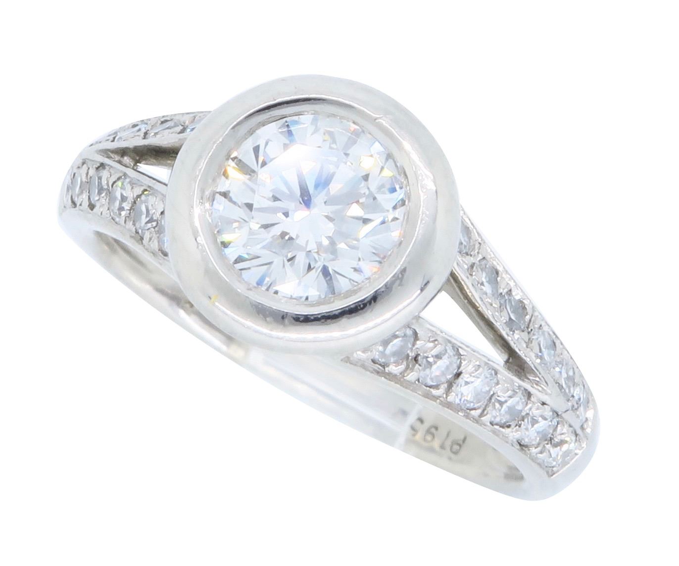 One Platinum 1.00ctw Diamond Ring. (1) Round center Diamond with a total weight of 0.70cts with a color of I and clarity VS-2. Round side Diamonds with a total weight of 0.30cts. Total weight of this ring is 5.9 grams.