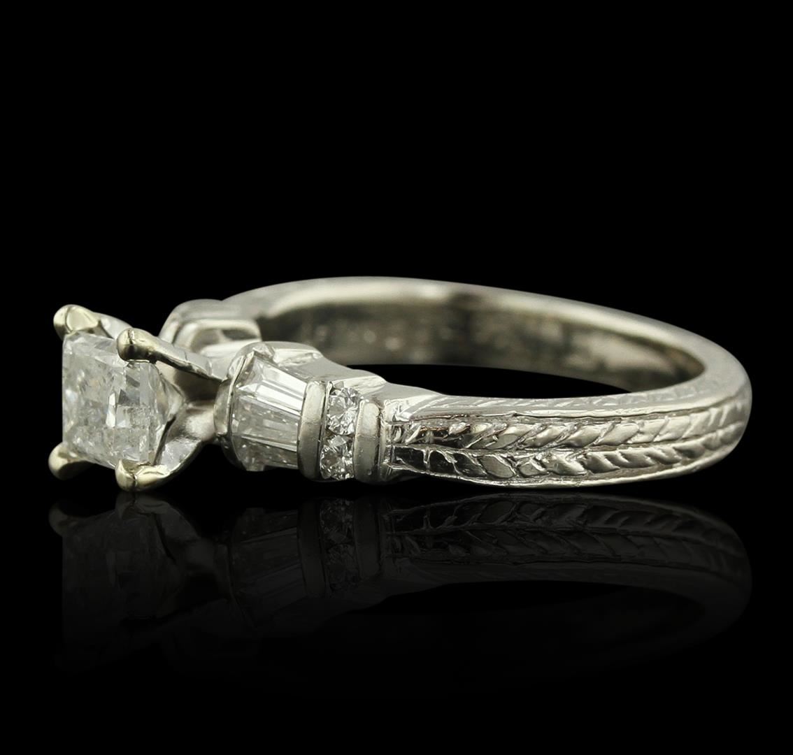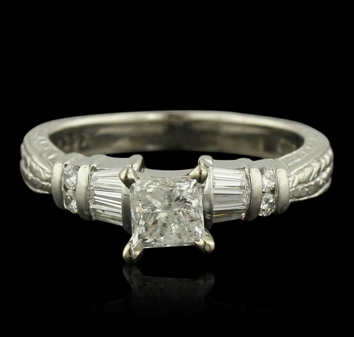 One electronically tested platinum ladies cast & assembled diamond unity ring with a bright and patterned finish. Condition is new, good workmanship. The featured diamond is cathedral set supported by diamond set shoulders, completed by a two and one-half millimeter wide band. Trademark is LeVian. Identified with markings of "PLAT 900". Containing: One prong set princess cut diamond, measuring 4.60 x 4.50 x 3.90mm (depth est.) approximate weight of 0.69ct with a medium strong blue fluorescence. Graded in the setting. Clarity: I-1. Color: 86.7%. Table 77.8%. Four channel set round brilliant cut diamonds, measuring 1.70 - 1.60 x 0.99mm (depth est.) approximate. Total Weight of 4 Stones = 0.10ct. Graded in the setting. Clarity: VS-2 to SI-1. Color: G - I Six channel set baguette cut (tapered) diamonds, measuring from 3.00 x 1.30 x 0.91mm (depth est.) to 3.20 x 1.40 x 0.98mm (depth est.) approximate. Total Weight of 6 Stones = 0.22ct. Graded in the setting. Clarity: VS-1 to VS-2. Color: G - I. Total Weight of Diamonds 1.01ct. Total Weight of Ring 7.47 grams. AIG Appraised at $7,530.00.