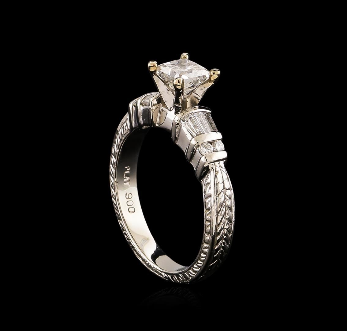 One electronically tested platinum ladies cast & assembled diamond unity ring with a bright and patterned finish. Condition is new, good workmanship. The featured diamond is cathedral set supported by diamond set shoulders, completed by a two and one-half millimeter wide band. Trademark is LeVian. Identified with markings of "PLAT 900". Containing: One prong set princess cut diamond, measuring 4.60 x 4.50 x 3.90mm (depth est.) approximate weight of 0.69ct with a medium strong blue fluorescence. Graded in the setting. Clarity: I-1. Color: 86.7%. Table 77.8%. Four channel set round brilliant cut diamonds, measuring 1.70 - 1.60 x 0.99mm (depth est.) approximate. Total Weight of 4 Stones = 0.10ct. Graded in the setting. Clarity: VS-2 to SI-1. Color: G - I Six channel set baguette cut (tapered) diamonds, measuring from 3.00 x 1.30 x 0.91mm (depth est.) to 3.20 x 1.40 x 0.98mm (depth est.) approximate. Total Weight of 6 Stones = 0.22ct. Graded in the setting. Clarity: VS-1 to VS-2. Color: G - I. Total Weight of Diamonds 1.01ct. Total Weight of Ring 7.47 grams. AIG Appraised at $7,530.00.