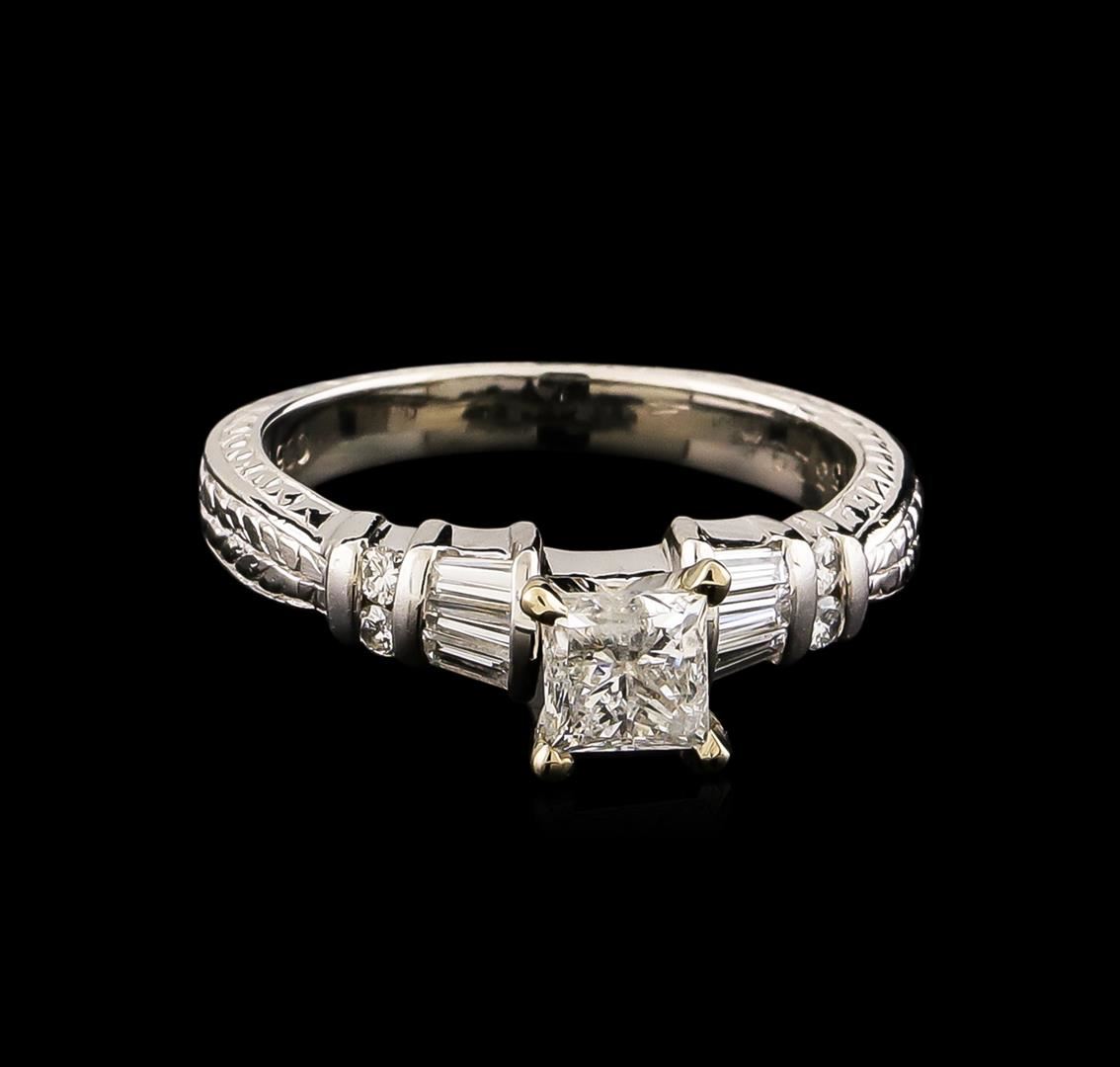 One electronically tested platinum ladies cast & assembled diamond unity ring with a bright and patterned finish. Condition is new, good workmanship. The featured diamond is cathedral set supported by diamond set shoulders, completed by a two and one-half millimeter wide band. Trademark is LeVian. Identified with markings of "PLAT 900". Containing: One prong set princess cut diamond, measuring 4.60 x 4.50 x 3.90mm (depth est.) approximate weight of 0.69ct with a medium strong blue fluorescence. Graded in the setting. Clarity: I-1. Color: 86.7%. Table 77.8%. Four channel set round brilliant cut diamonds, measuring 1.70 - 1.60 x 0.99mm (depth est.) approximate. Total Weight of 4 Stones = 0.10ct. Graded in the setting. Clarity: VS-2 to SI-1. Color: G - I Six channel set baguette cut (tapered) diamonds, measuring from 3.00 x 1.30 x 0.91mm (depth est.) to 3.20 x 1.40 x 0.98mm (depth est.) approximate. Total Weight of 6 Stones = 0.22ct. Graded in the setting. Clarity: VS-1 to VS-2. Color: G - I. Total Weight of Diamonds 1.01ct. Total Weight of Ring 7.47 grams. AIG Appraised at $7,530.00.