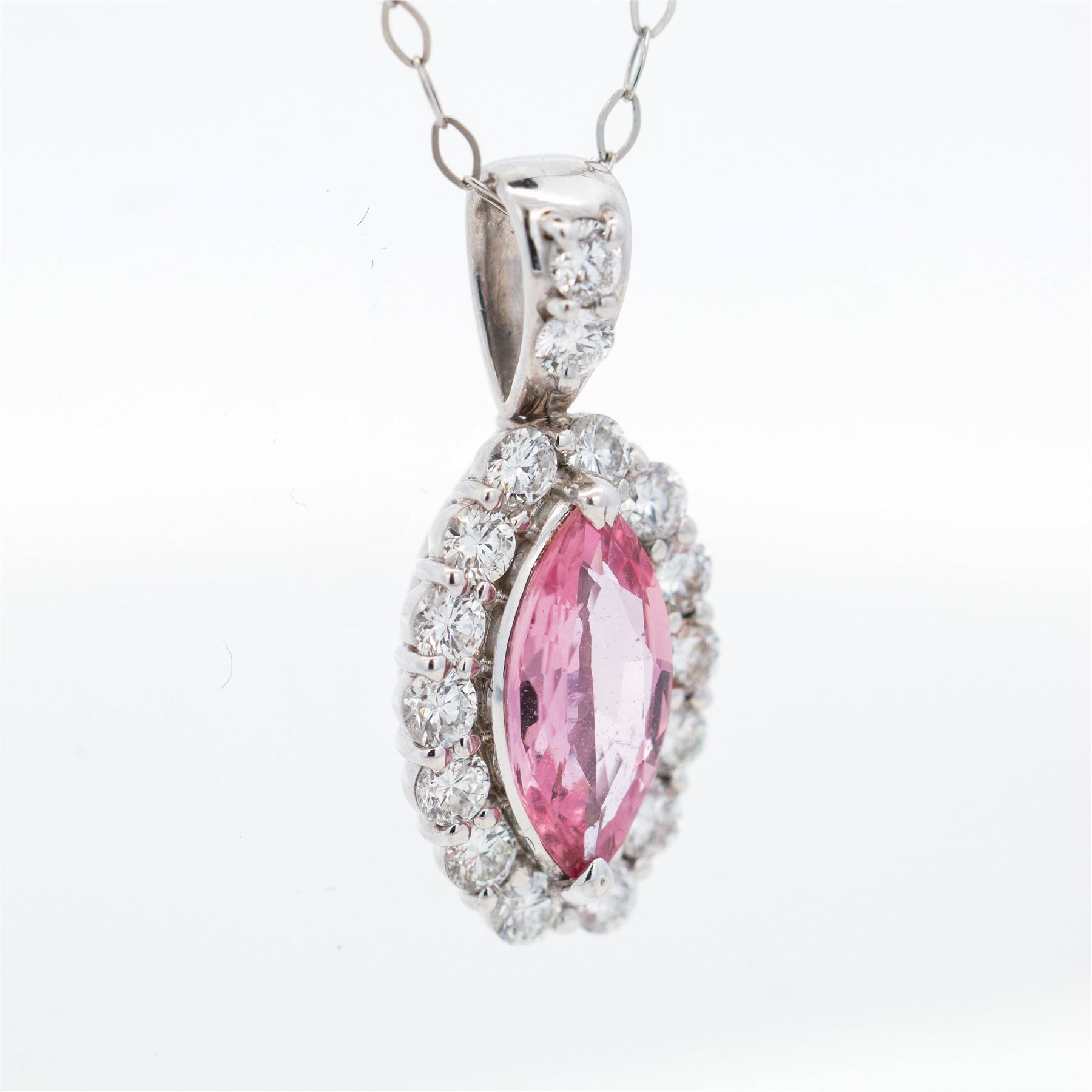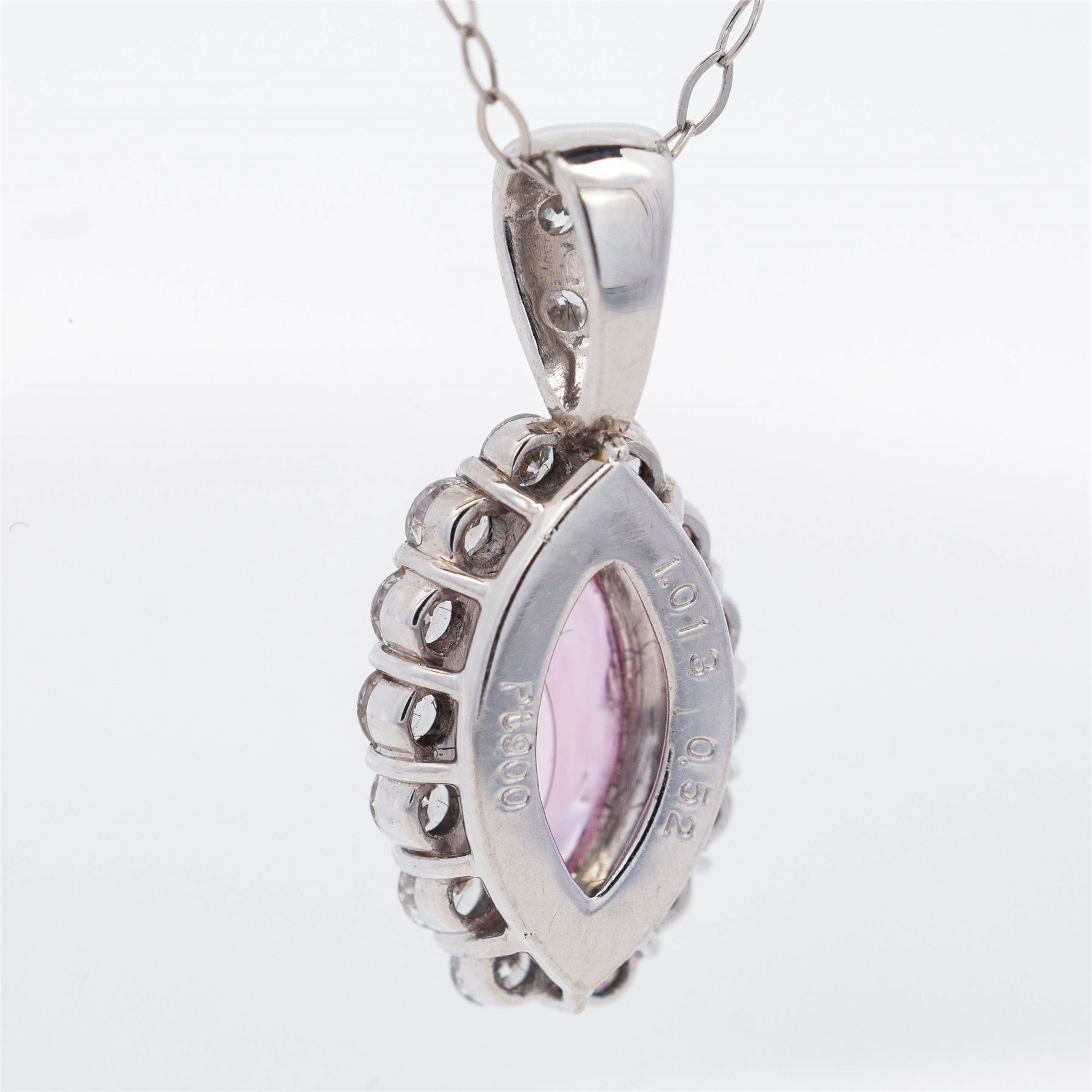 An 18 inch platinum cable chain suspends a detachable navette-shaped cluster pendant featuring a 1.013 ct marquise-brilliant cut natural sapphire of vivid pink color. The sapphire is claw-set within a halo of thirteen near-colorless round brilliant diamonds, with three additional diamonds grain-set into the tapered bail. All diamonds are well matched, supplying lively contrast to the richly saturated center stone. The pendant and bail are manufactured in platinum alloys (PT950 pendant frame, PT900 bail) with a pierced gallery and high-polish finish; the chain secures with a spring-ring clasp.