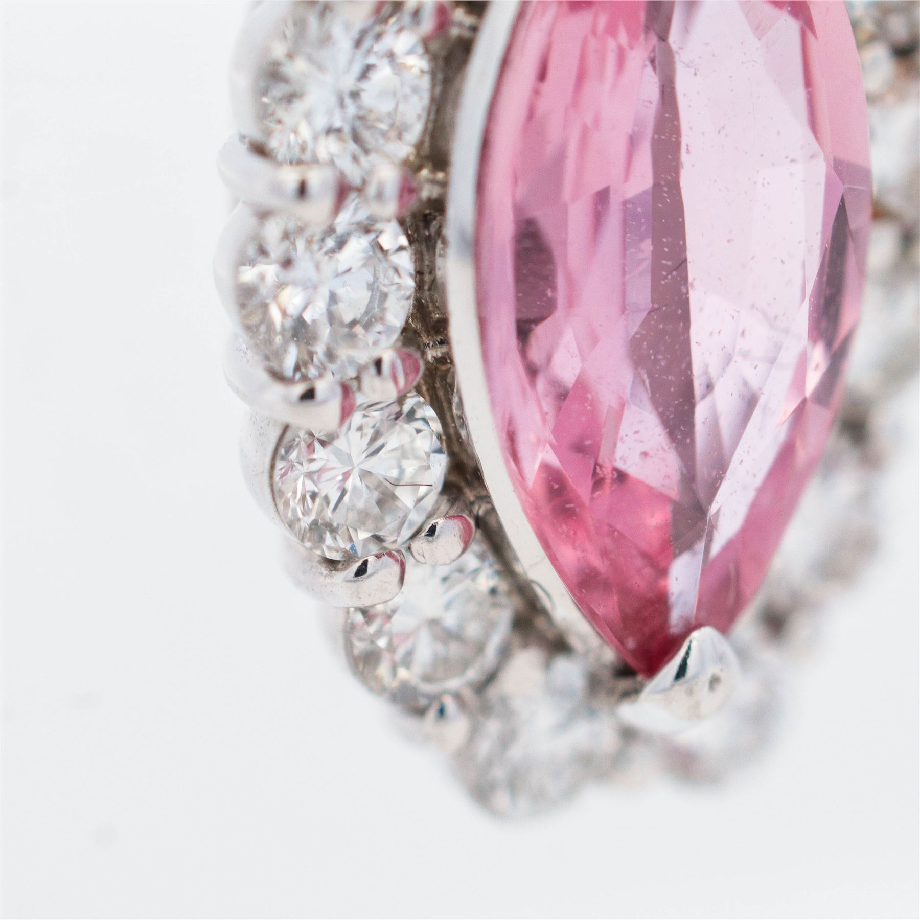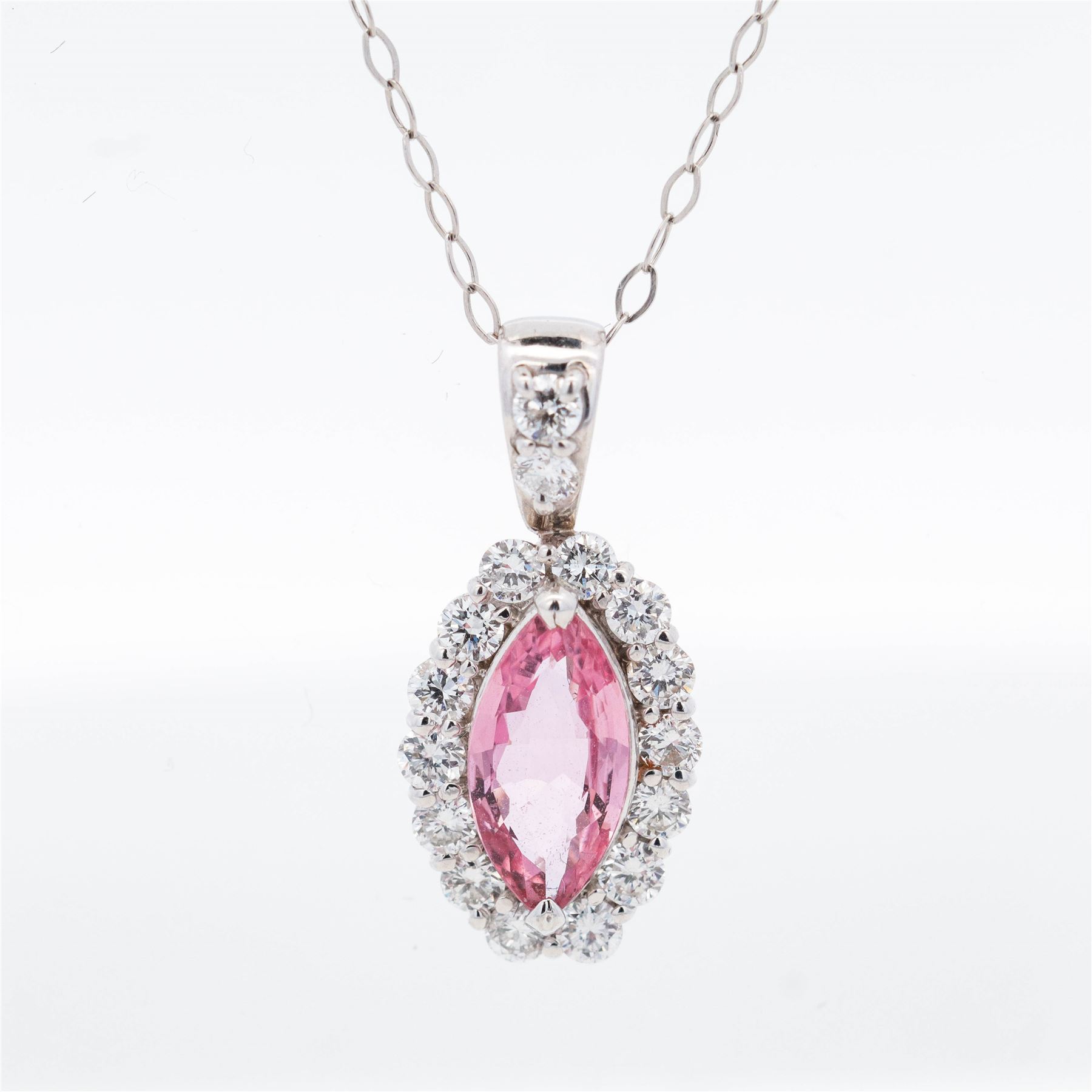 An 18 inch platinum cable chain suspends a detachable navette-shaped cluster pendant featuring a 1.013 ct marquise-brilliant cut natural sapphire of vivid pink color. The sapphire is claw-set within a halo of thirteen near-colorless round brilliant diamonds, with three additional diamonds grain-set into the tapered bail. All diamonds are well matched, supplying lively contrast to the richly saturated center stone. The pendant and bail are manufactured in platinum alloys (PT950 pendant frame, PT900 bail) with a pierced gallery and high-polish finish; the chain secures with a spring-ring clasp.