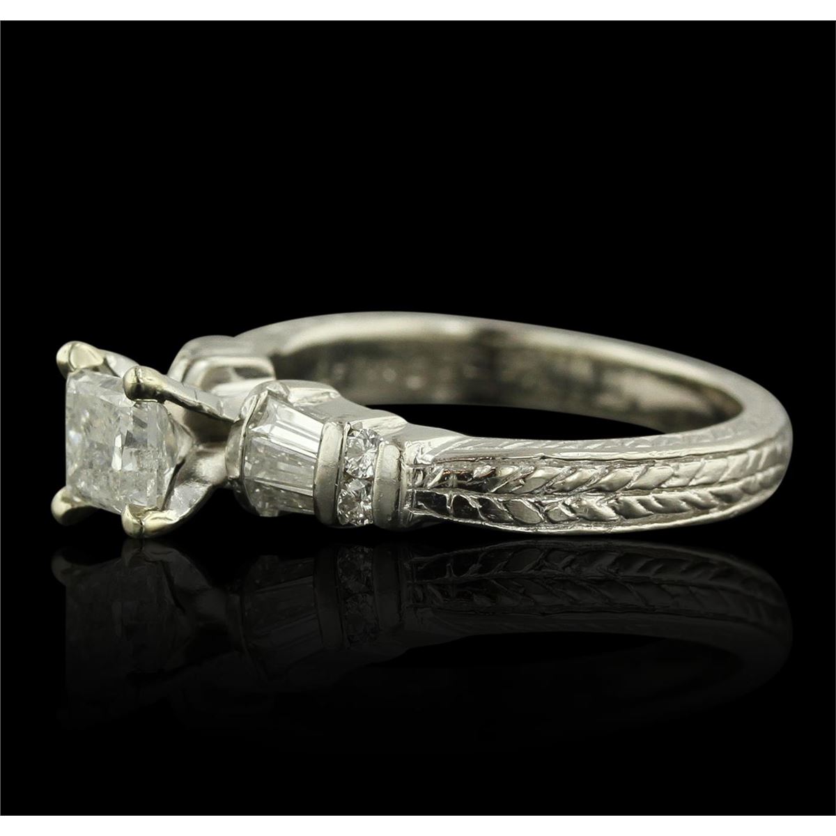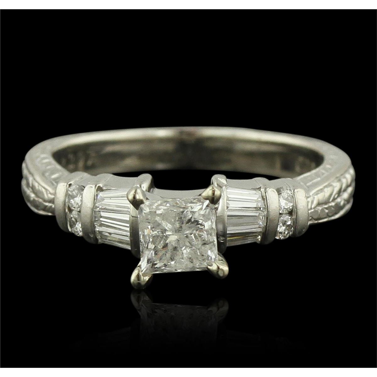 One electronically tested platinum ladies cast & assembled diamond unity ring with a bright and patterned finish. Condition is new, good workmanship. The featured diamond is cathedral set supported by diamond set shoulders, completed by a two and one-half millimeter wide band. Trademark is LeVian. Identified with markings of "PLAT 900". Containing: One prong set princess cut diamond, measuring 4.60 x 4.50 x 3.90mm (depth est.) approximate weight of 0.69ct with a medium strong blue fluorescence. Graded in the setting. Clarity: I-1. Color: 86.7%. Table 77.8%. Four channel set round brilliant cut diamonds, measuring 1.70 - 1.60 x 0.99mm (depth est.) approximate. Total Weight of 4 Stones = 0.10ct. Graded in the setting. Clarity: VS-2 to SI-1. Color: G - I Six channel set baguette cut (tapered) diamonds, measuring from 3.00 x 1.30 x 0.91mm (depth est.) to 3.20 x 1.40 x 0.98mm (depth est.) approximate. Total Weight of 6 Stones = 0.22ct. Graded in the setting. Clarity: VS-1 to VS-2. Color: G - I. Total Weight of Diamonds 1.01ct. Total Weight of Ring 7.47 grams. AIG Appraised at $7,530.00.