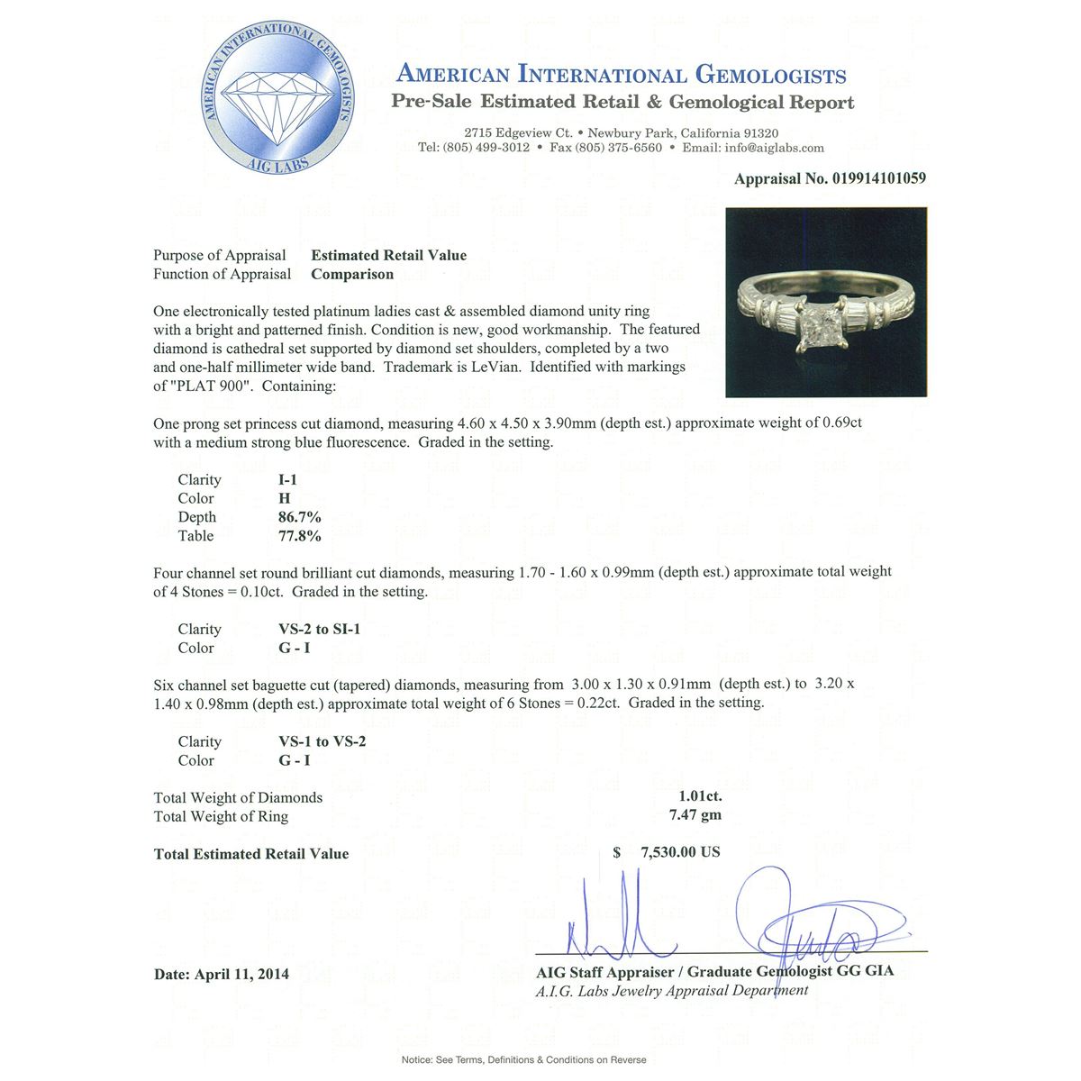 One electronically tested platinum ladies cast & assembled diamond unity ring with a bright and patterned finish. Condition is new, good workmanship. The featured diamond is cathedral set supported by diamond set shoulders, completed by a two and one-half millimeter wide band. Trademark is LeVian. Identified with markings of "PLAT 900". Containing: One prong set princess cut diamond, measuring 4.60 x 4.50 x 3.90mm (depth est.) approximate weight of 0.69ct with a medium strong blue fluorescence. Graded in the setting. Clarity: I-1. Color: 86.7%. Table 77.8%. Four channel set round brilliant cut diamonds, measuring 1.70 - 1.60 x 0.99mm (depth est.) approximate. Total Weight of 4 Stones = 0.10ct. Graded in the setting. Clarity: VS-2 to SI-1. Color: G - I Six channel set baguette cut (tapered) diamonds, measuring from 3.00 x 1.30 x 0.91mm (depth est.) to 3.20 x 1.40 x 0.98mm (depth est.) approximate. Total Weight of 6 Stones = 0.22ct. Graded in the setting. Clarity: VS-1 to VS-2. Color: G - I. Total Weight of Diamonds 1.01ct. Total Weight of Ring 7.47 grams. AIG Appraised at $7,530.00.