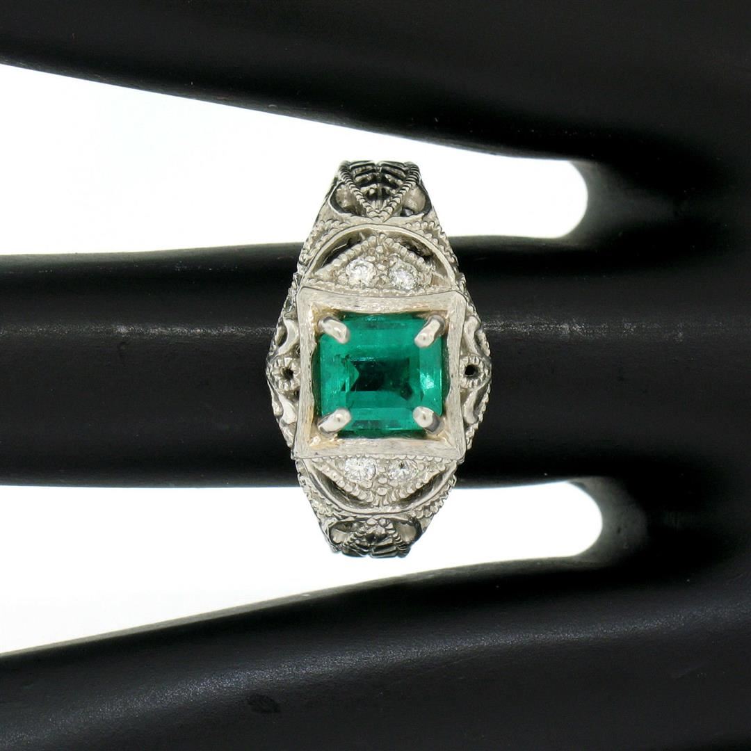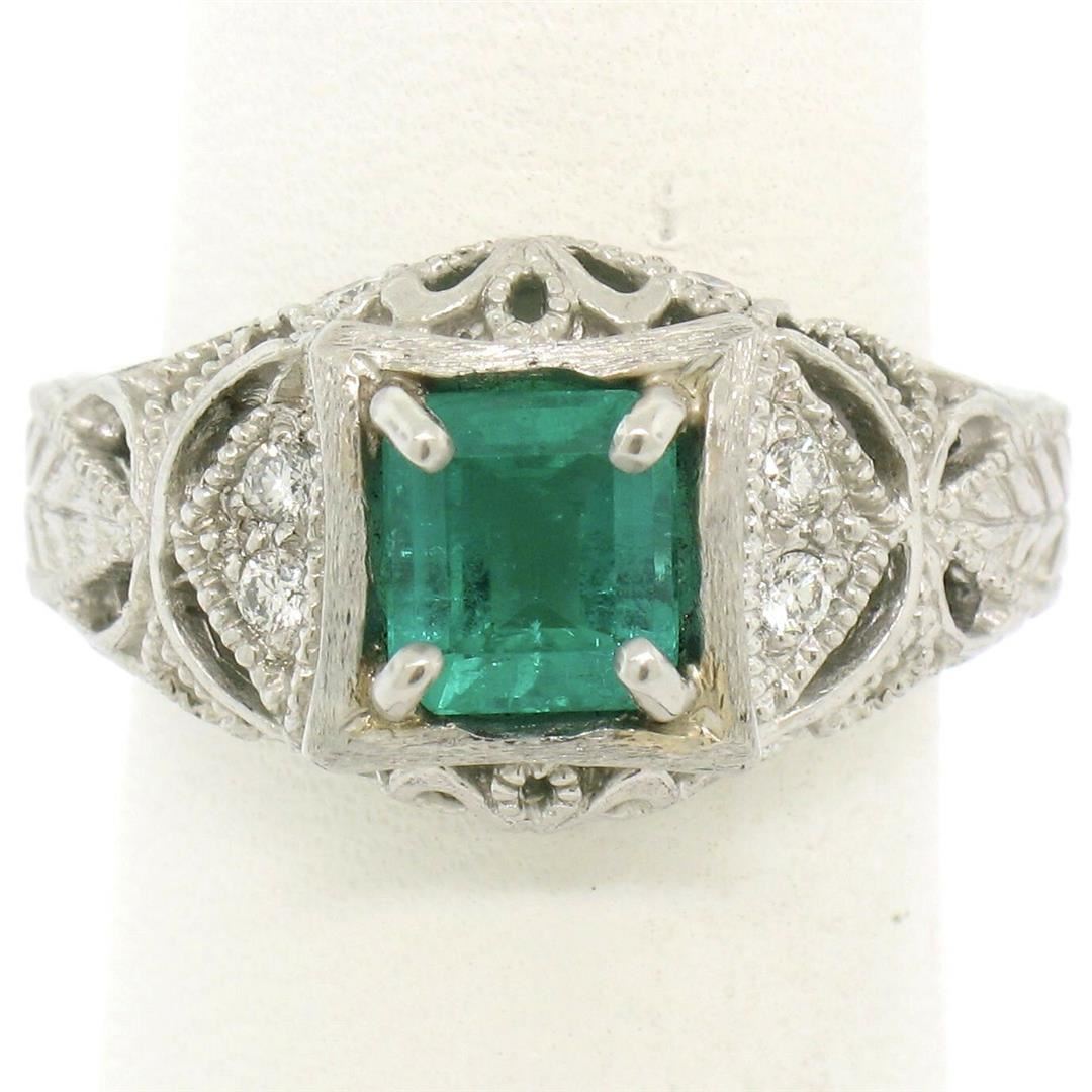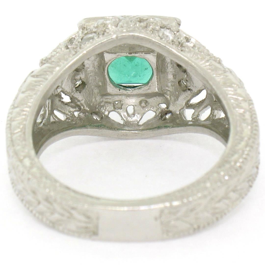 A solid 950 platinum cocktail ring featuring a radiant cut natural emerald (0.92ct) prong set at its center accented by 8 pave set round brilliant cut natural diamonds (F - VS1; 0.12ctw). The ring is size 5.5, weighs a total of 11.09 grams, and measures 11.85mm wide.