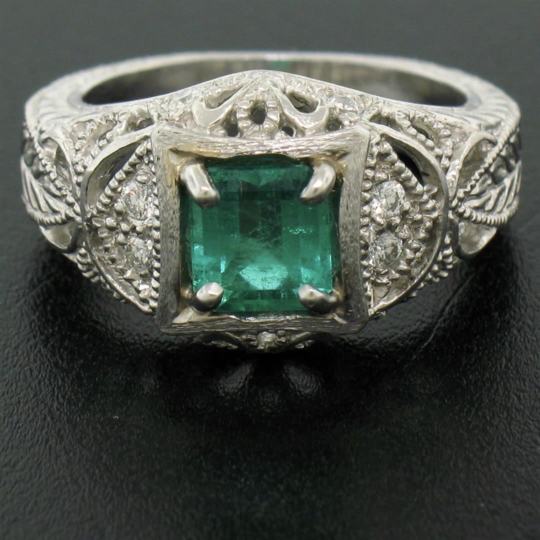 Platinum 1.04ct Radiant Emerald & Diamond Milgrain Filigree Etched Cocktail Ring. Please see photos and description for all available information. An estate solid platinum cocktail ring, faeturing 1 radiant cut natural emerald (0.92ct), and 8 round brilliant cut natural diamonds (F- VS1; 0.12ctw). The ring is size 5.5, weighs a total of 11.09 grams, and measures 11.85mm wide.