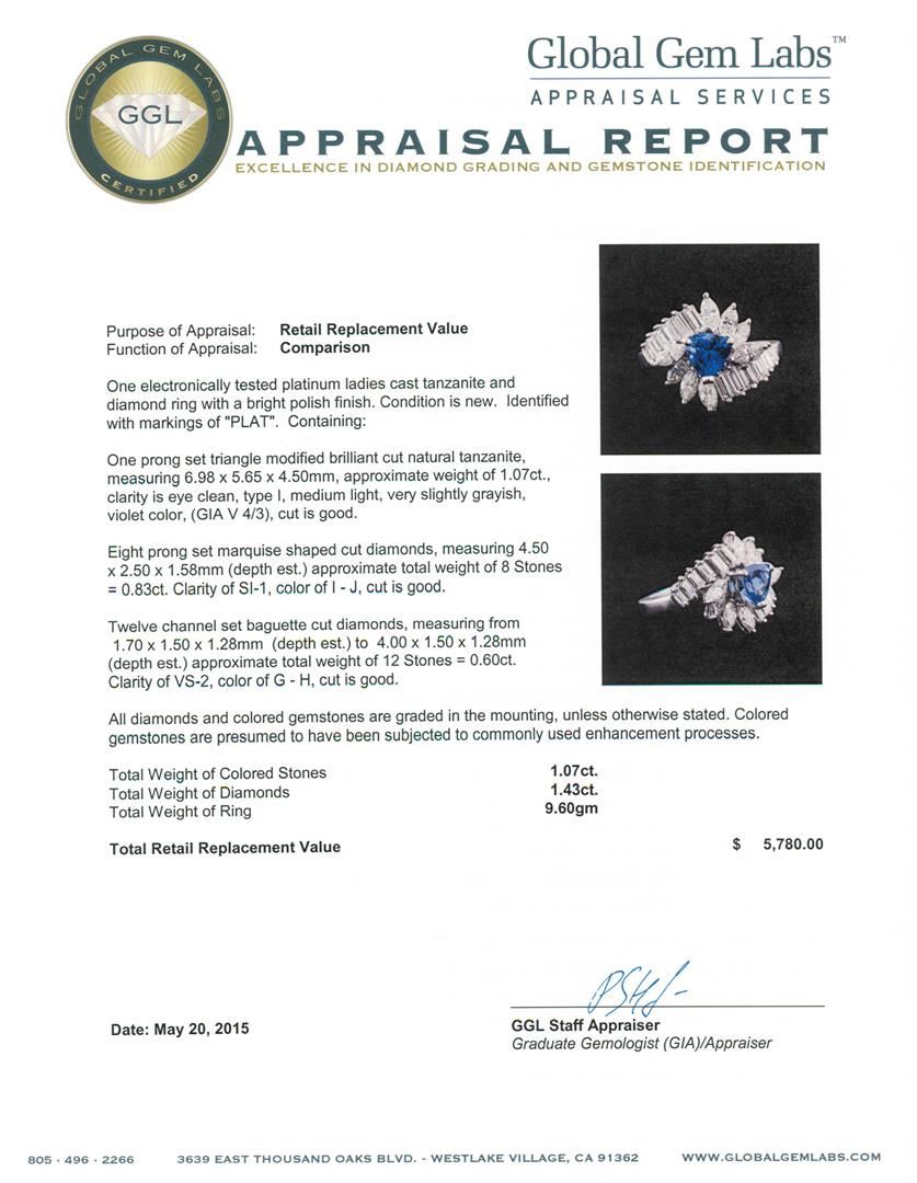 One electronically tested platinum ladies cast tanzanite and diamond ring with a bright polish finish. Identified with markings of "PLAT". Condition is new. Containing: One prong set triangle modified brilliant cut natural tanzanite, measuring 6.98 x 5.65 x 4.50mm, approximate weight of 1.07ct., clarity is eye clean, type I, medium light, very slightly grayish, violet color, (GIA V 4/3), cut is good. Eight prong set marquise shaped cut diamonds, measuring 4.50 x 2.50 x 1.58mm (depth est.) approximate total weight of 8 Stones = 0.83ct. Clarity: SI-1. Color: I - J, Cut is Good. Twelve channel set baguette cut diamonds, measuring from 1.70 x 1.50 x 1.28mm (depth est.) to 4.00 x 1.50 x 1.28mm (depth est.) approximate total weight of 12 Stones = 0.60 ct. Clarity: VS-2. Color: G - H, Cut is Good. All diamonds and colored gemstones are graded in the mounting, unless otherwise stated. Colored gemstones are presumed to have been subjected to commonly used enhancement processes. Total Weight of Colored Stones 1.07ct. Total Weight of Diamonds 1.43ct. Total Weight of Ring 9.60 grams.
