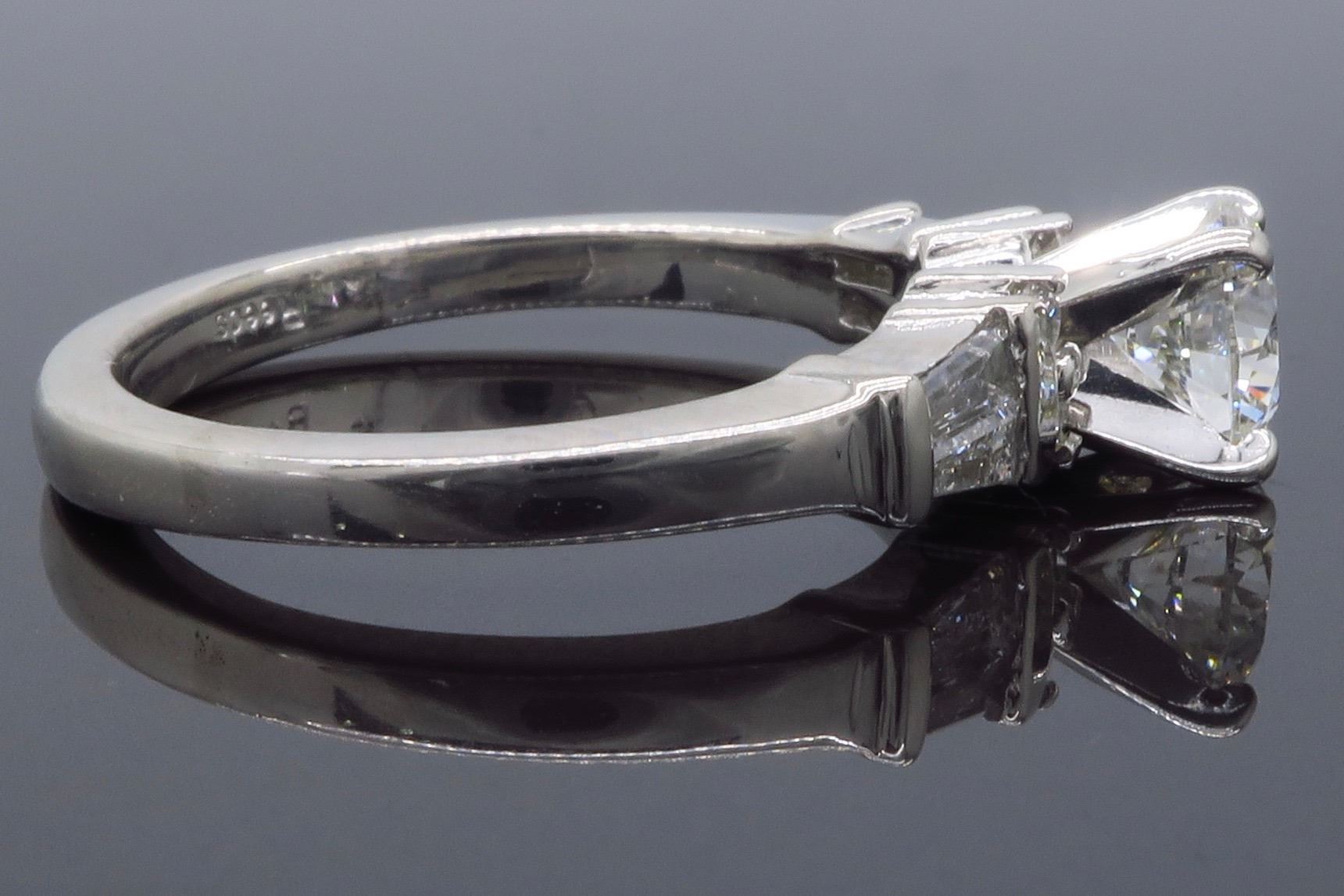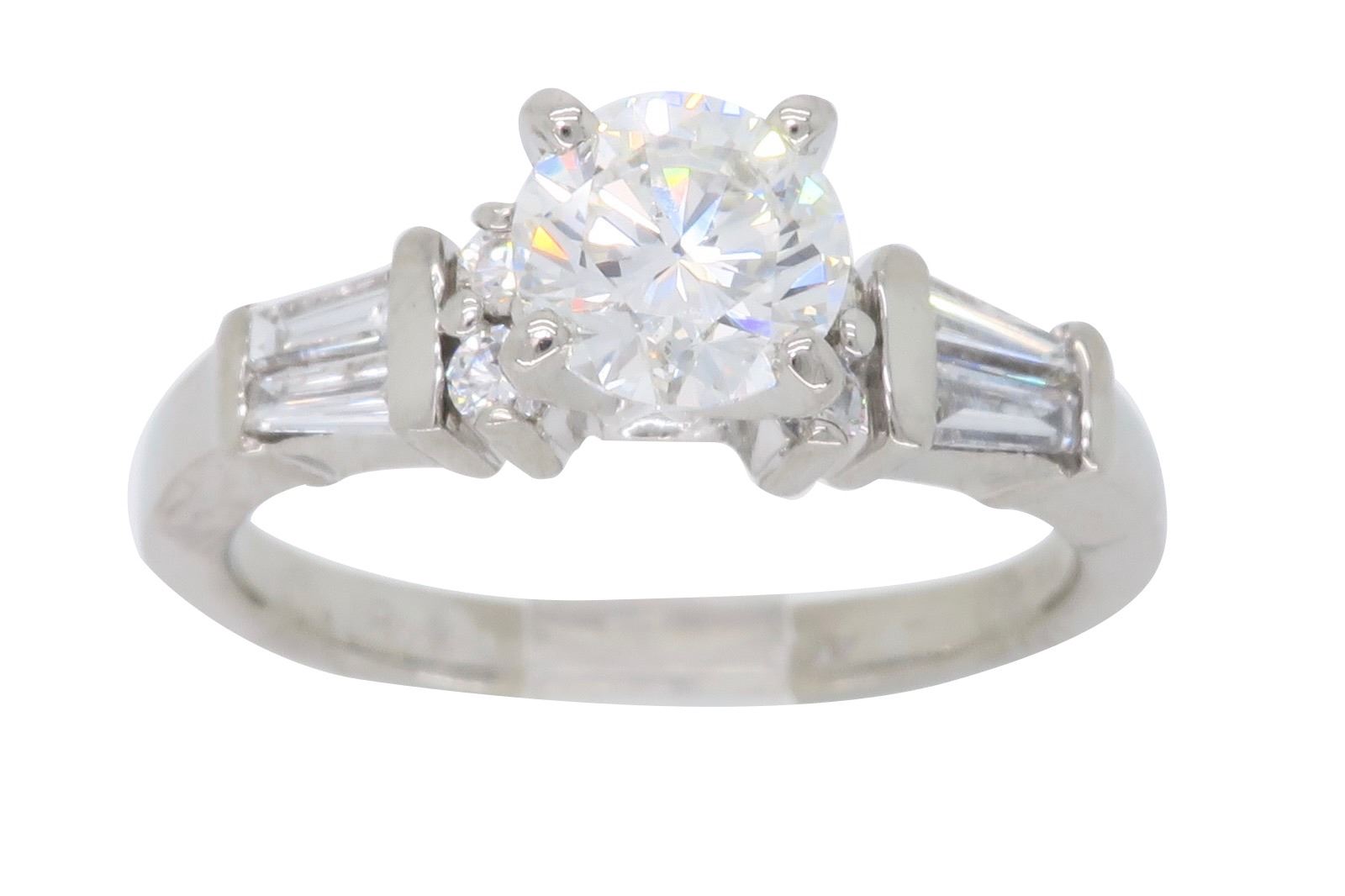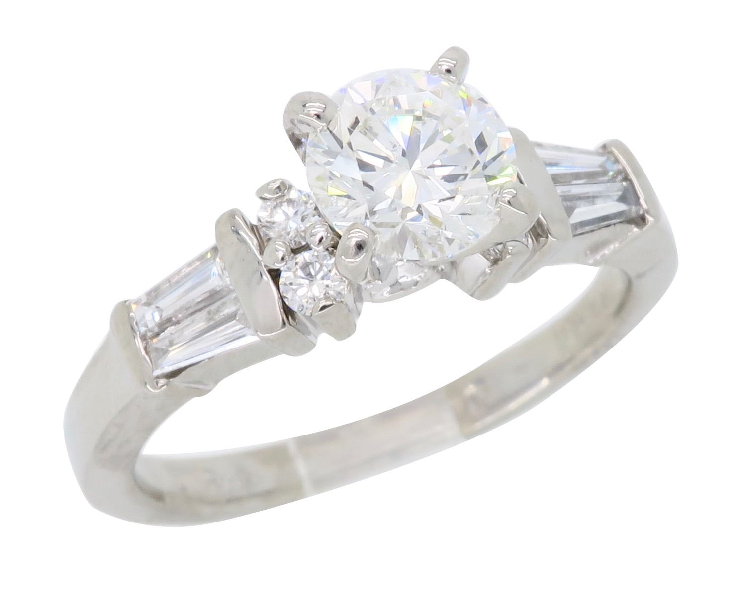 One Platinum 1.10ctw Diamond Ring. (1) Round Diamond with a total weight of 0.82cts with a color of H-I and clarity of SI-1. (4) side baguette and (4) side round Diamonds with a total weight of 0.28cts. Total weight of this ring is 7.4 grams.