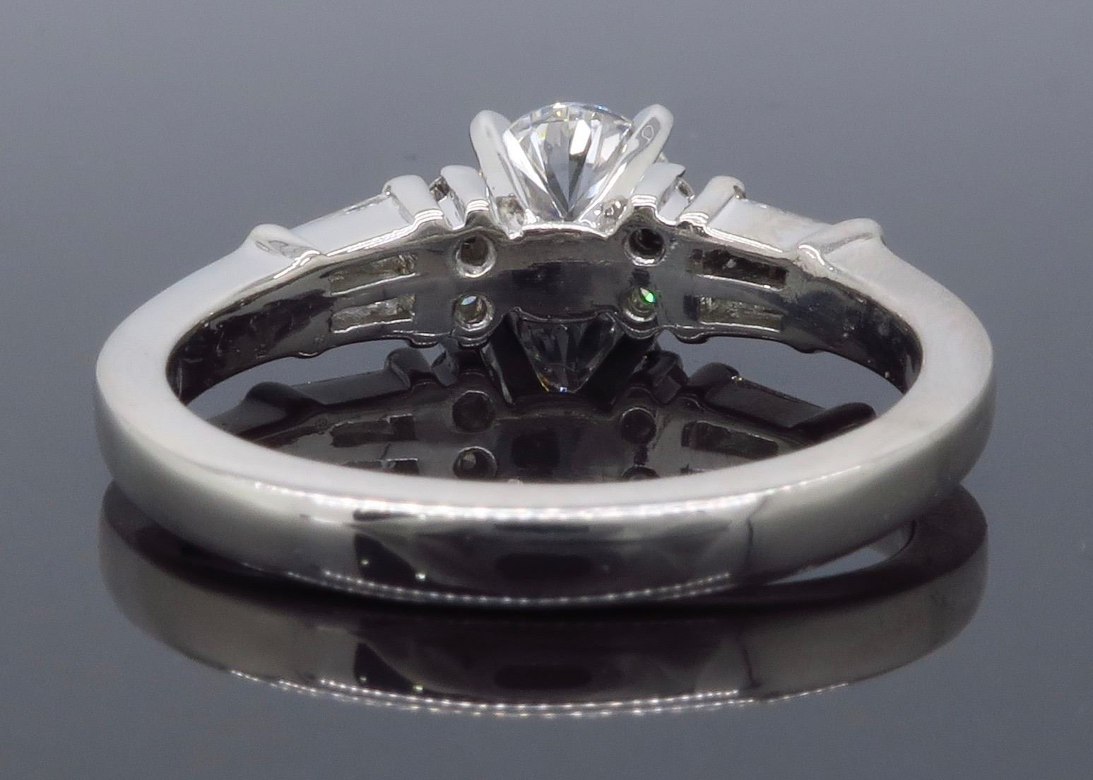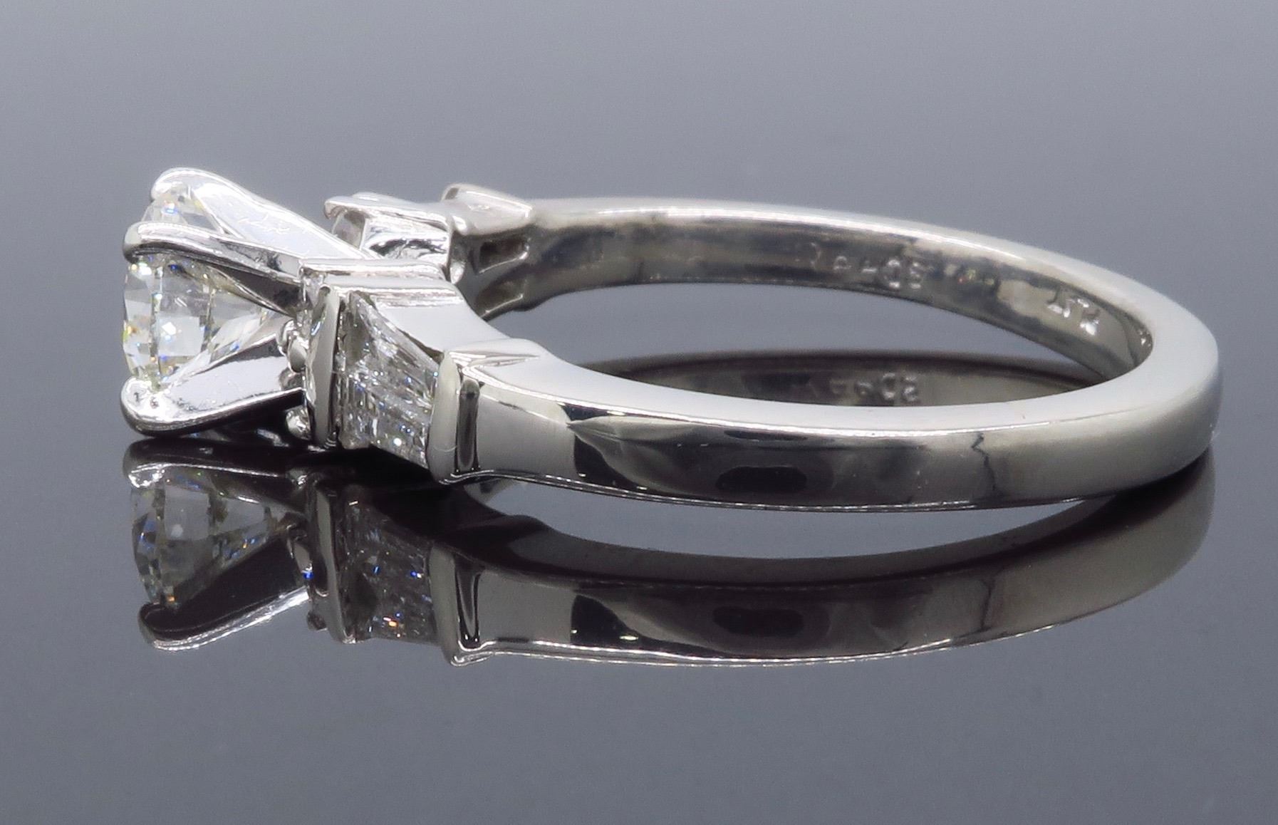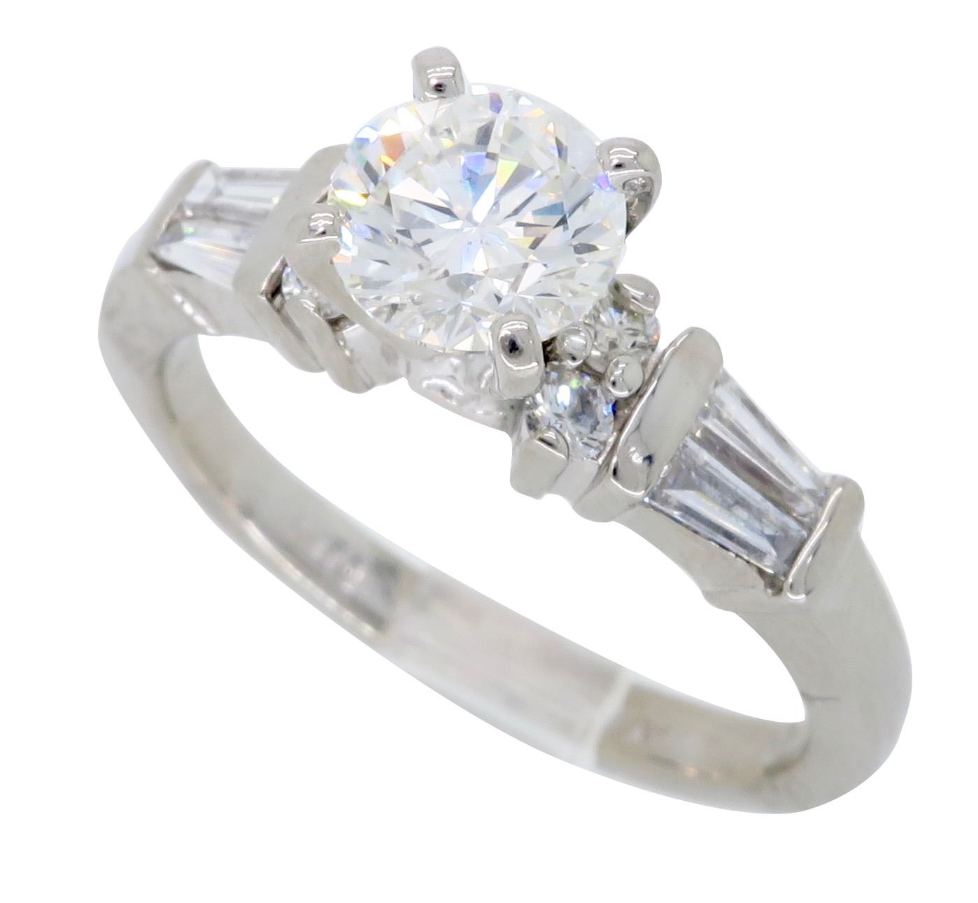 One Platinum 1.10ctw Diamond Ring. (1) Round Diamond with a total weight of 0.82cts with a color of H-I and clarity of SI-1. (4) side baguette and (4) side round Diamonds with a total weight of 0.28cts. Total weight of this ring is 7.4 grams.