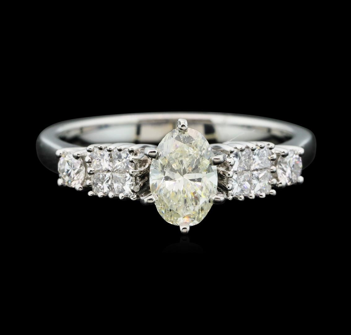 One electronically tested platinum lady's cast wedding ring with a cathedral shank with a bright polish finish. The featured lady's ring has a shank measuring 2.15 millimeters wide. Identified with markings of "PT 950". Condition is new, good workmanship. Containing: One prong set oval shaped cut diamond, measuring 6.80 x 4.70 x 3.50mm (depth est.) approximate weight of 0.73ct. Graded in the setting. Clarity: SI-2. Color: I - JCut Good Two prong set round brilliant cut diamonds, measuring 2.60 - 2.55 x 1.60mm (depth est.) approximate total weight of 2 Stones = 0.13ct. Graded in the setting. Clarity: VS-2 to SI-2. Color: G - HCut Very Good Eight invisible set princess cut diamonds, measuring 1.70 x 1.65 x 1.24mm (depth est.) approximate total weight of 8 Stones = 0.25ct. Graded in the setting. Clarity: VS-2 to SI-1. Color: F - GCut Very Good. Total Weight of Diamonds 1.11ct. Total Weight of Ring 5.70gm. GAS Appraised.
