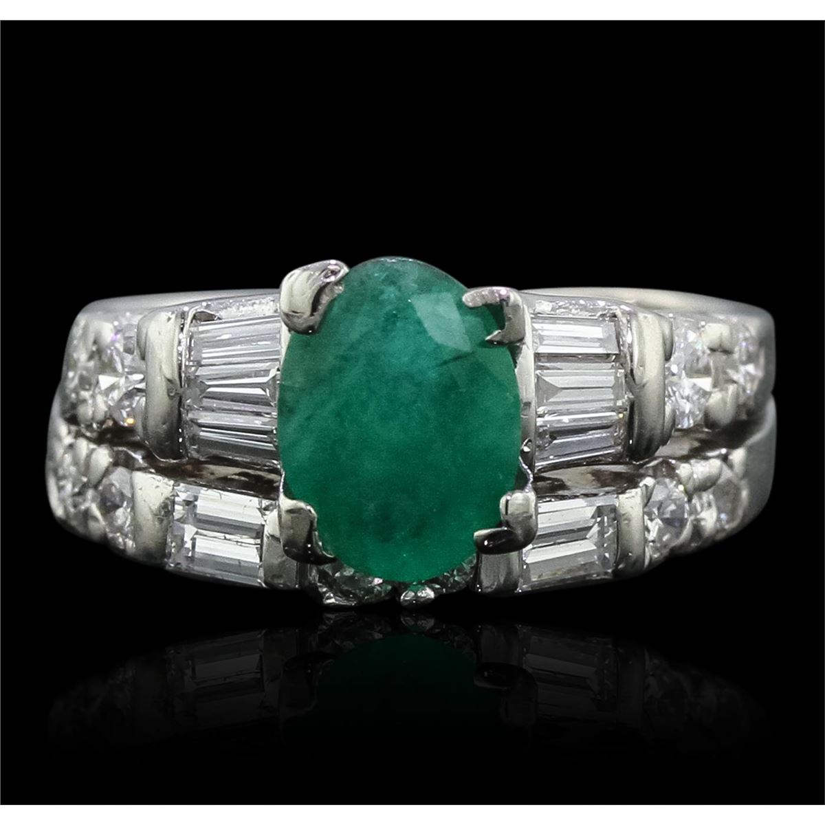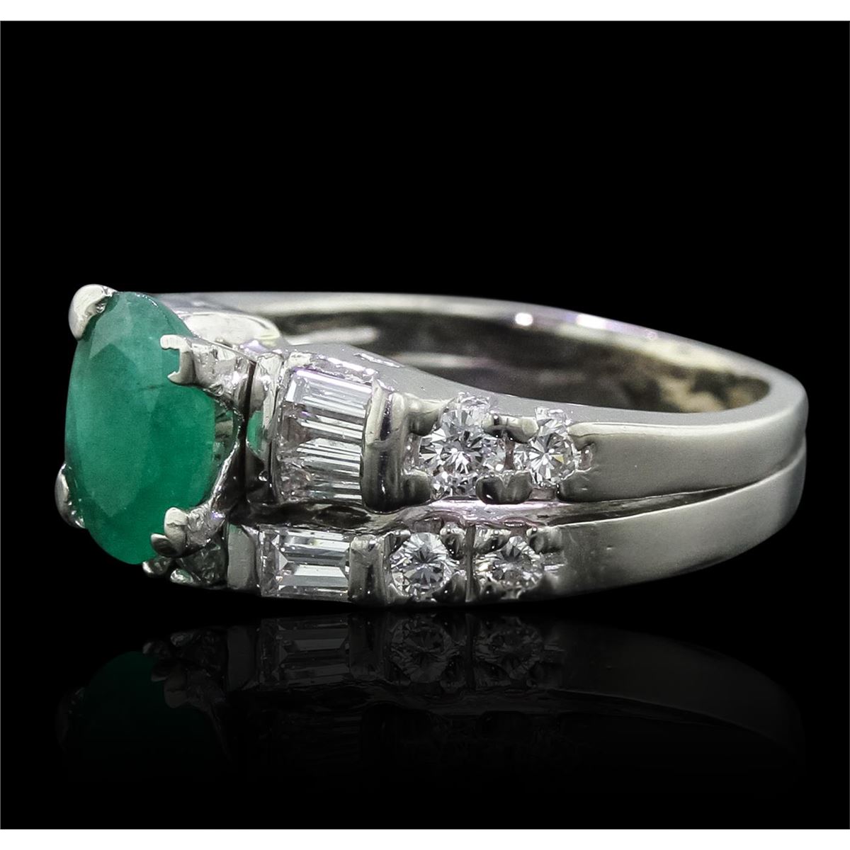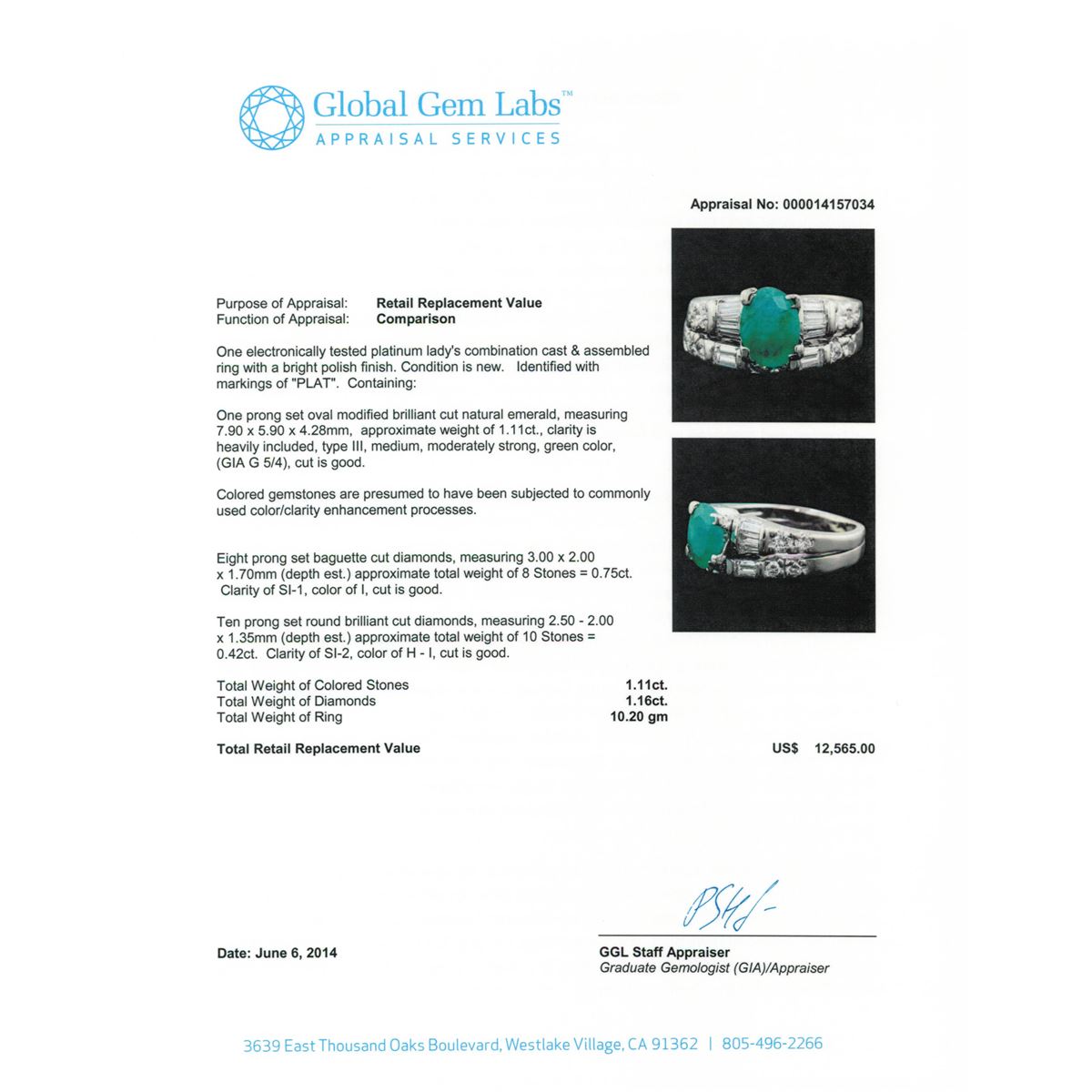 One electronically tested platinum Ladies combination cast & assembled ring with a bright polish finish. Condition is new. Identified with markings of "PLAT". Containing: One prong set oval modified brilliant cut natural emerald, measuring 7.90 x 5.90 x 4.28mm, approximate weight of 1.11ct., clarity is heavily included, type III, medium, moderately strong, green color, (GIA G 5/4), cut is good. Colored gemstones are presumed to have been subjected to commonly used color/clarity enhancement processes. Eight prong set baguette cut diamonds, measuring 3.00 x 2.00 x 1.70mm (depth est.) approximate. Total Weight of 8 Stones = 0.75ct. Clarity: SI-1. Color: I, Cut is Good. Ten prong set round brilliant cut diamonds, measuring 2.50 - 2.00 x 1.35mm (depth est.) approximate. Total Weight of 10 Stones = 0.42ct. Clarity: SI-2. Color: H - I, Cut is Good. Total Weight of Colored Stones 1.11ct. Total Weight of Diamonds 1.16ct. Total Weight of Ring 10.20 grams. GGL Appraised at $12,565.00.