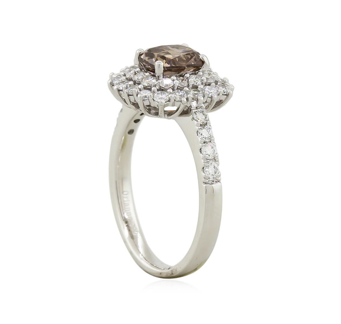 One electronically tested platinum ladies cast diamond ring with a bright polish finish. The featured diamond is set within a tiered diamond floret bezel supported by diamond set shoulders, completed by a two and one-half millimeter wide band. Trademark is Orianne. Identified with markings of "950". Condition is new, good workmanship. Containing: One prong set cushion cut diamond, measuring 6.65 x 5.70 x 3.39mm (depth est.) approximate weight of 1.13ct. Very faint pink secondary color throughout. Graded in the setting. Clarity: I-1. Depth: 54.9%. Table 59.9%. Forty prong set round brilliant cut diamonds approximate. Total Weight of 40 Stones = 0.89ct. Graded in the setting. Clarity: VS-1 to VS-2. Color: D - E. Total Weight of Diamonds 2.02ct. Total Weight of Ring 6.40gm. AIG Appraised at $14,060.00.