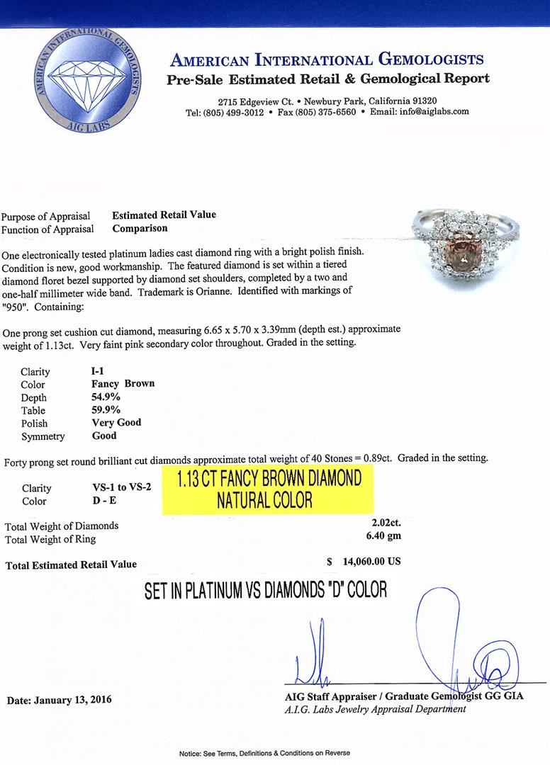 One electronically tested platinum ladies cast diamond ring with a bright polish finish. The featured diamond is set within a tiered diamond floret bezel supported by diamond set shoulders, completed by a two and one-half millimeter wide band. Trademark is Orianne. Identified with markings of "950". Condition is new, good workmanship. Containing: One prong set cushion cut diamond, measuring 6.65 x 5.70 x 3.39mm (depth est.) approximate weight of 1.13ct. Very faint pink secondary color throughout. Graded in the setting. Clarity: I-1. Depth: 54.9%. Table 59.9%. Forty prong set round brilliant cut diamonds approximate. Total Weight of 40 Stones = 0.89ct. Graded in the setting. Clarity: VS-1 to VS-2. Color: D - E. Total Weight of Diamonds 2.02ct. Total Weight of Ring 6.40gm. AIG Appraised at $14,060.00.