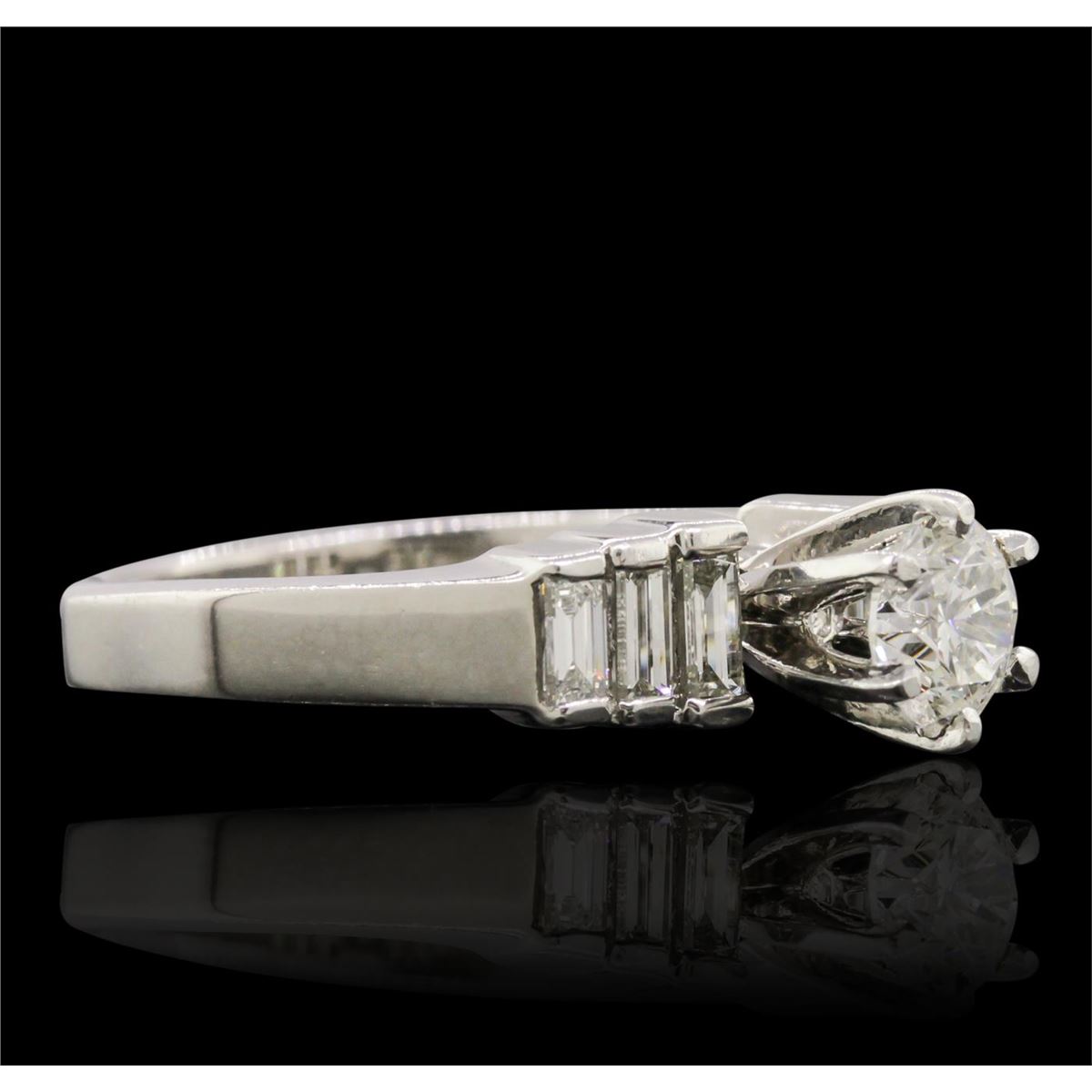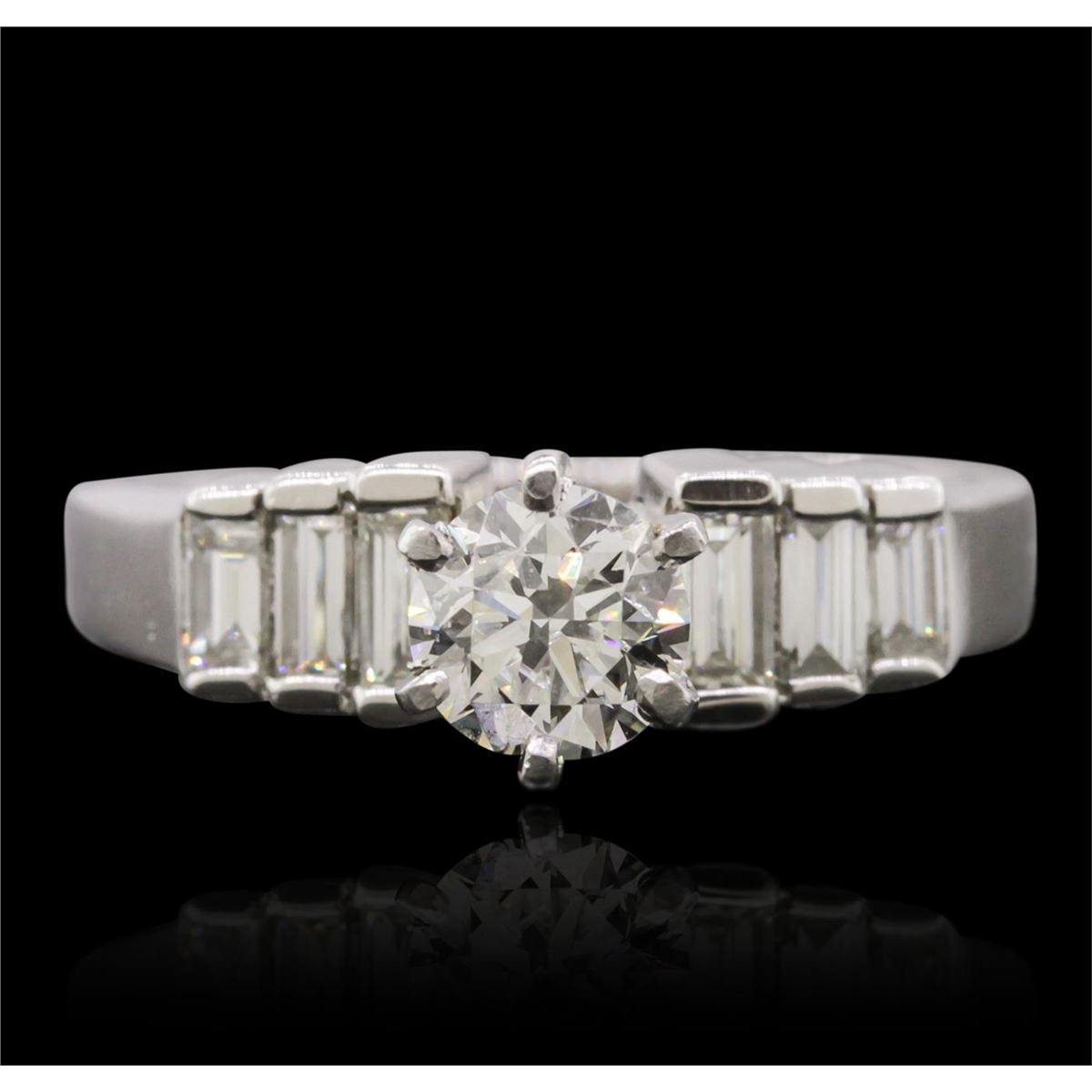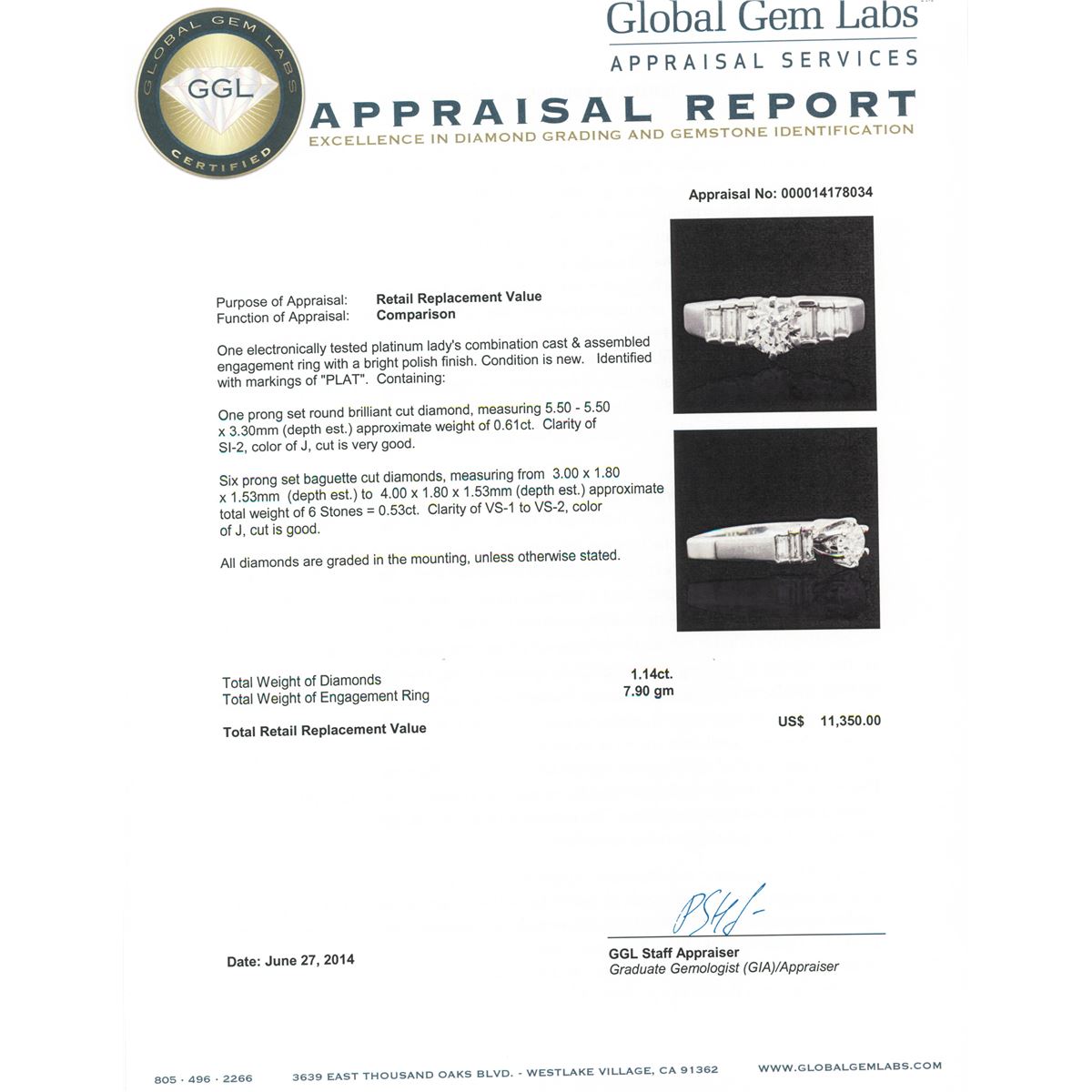 One electronically tested platinum Ladies combination cast & assembled engagement ring with a bright polish finish. Condition is new. Identified with markings of "PLAT". Containing: One prong set round brilliant cut diamond, measuring 5.50 - 5.50 x 3.30mm (depth est.) approximate weight of 0.61ct. Clarity: SI-2. Color: J, Cut is Very Good. Six prong set baguette cut diamonds, measuring from 3.00 x 1.80 x 1.53mm (depth est.) to 4.00 x 1.80 x 1.53mm (depth est.) approximate total weight of 6 Stones = 0.53ct. Clarity: VS-1 to VS-2. Color: J, Cut is Good. All diamonds are graded in the mounting, unless otherwise stated. Total Weight of Diamonds 1.14ct. Total Weight of Engagement Ring 7.90 grams. GGL Appraised at $11,350.00.