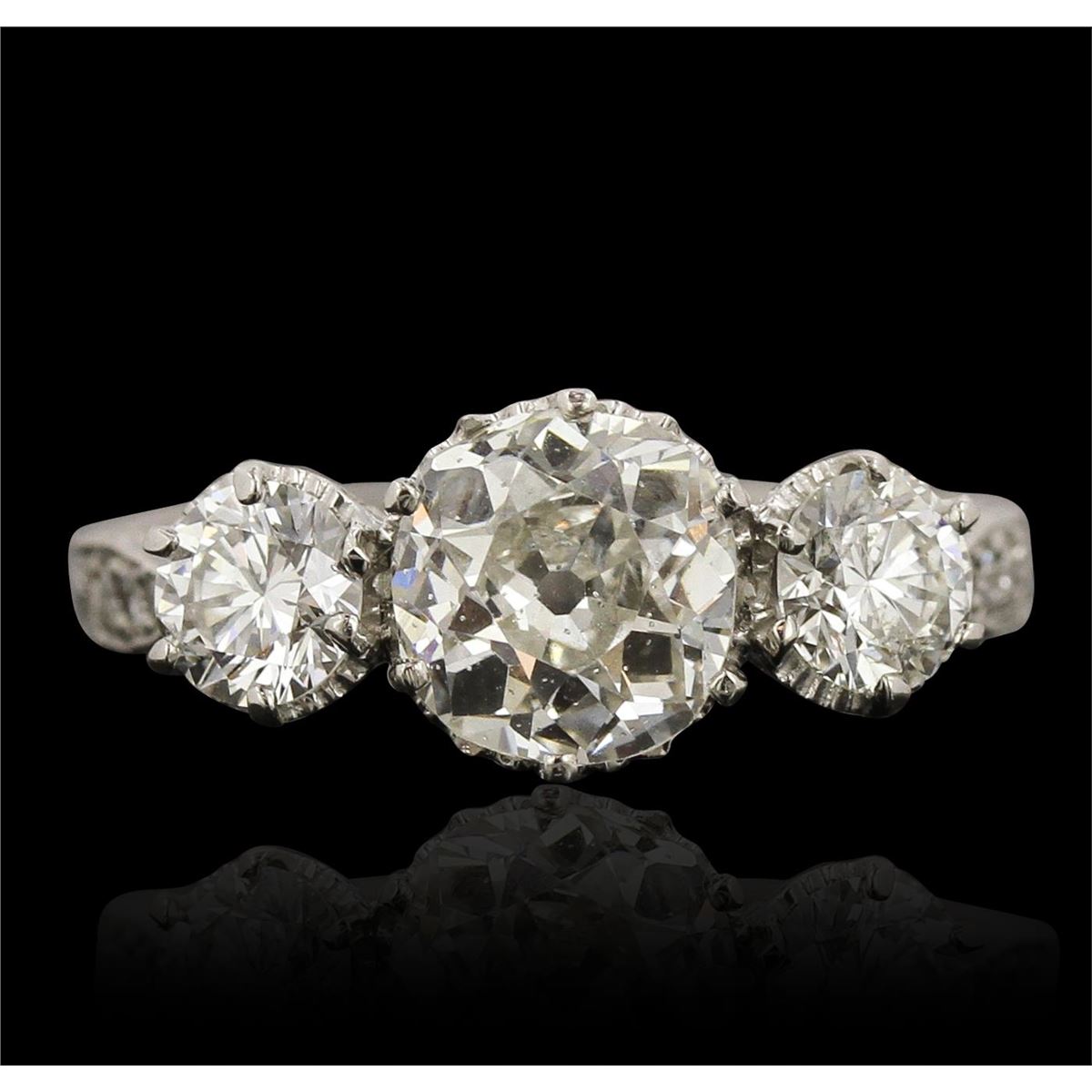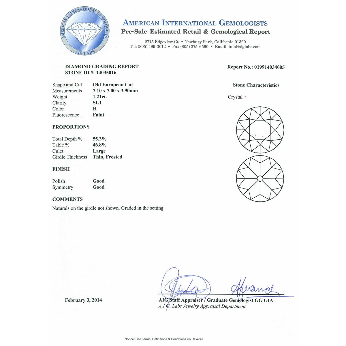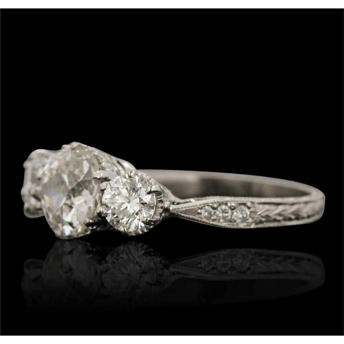 One electronically tested Platinum ladies cast diamond ring. Condition is good. The diamond trio is set within a diamond set lattice gallery, supported by diamond set shoulders and completed by a one and one-half millimeter wide band. Bright and patterned finish with milgrain detailing throughout. Identified with markings of "950 Pt". Containing: One prong set Old European cut diamond, measuring 7.10 - 7.00 x 3.90mm (depth est.) approximate weight of 1.21ct with a faint fluorescence. Cutting style circa early 19th century. Diamond Grading Report attached. Graded in the setting. Clarity: SI-1. Color: H. Depth 55.3%. Table 46.8%. Two prong set round brilliant cut diamonds, measuring 4.50 - 4.50 x 2.70mm (depth est.) approximate. Total Weight of 2 Stones = 0.75ct. Graded in the setting. Clarity: SI-2 to I-1. Color: G - H. Thirty-Eight bead set round brilliant cut diamonds, measuring 1.50 - 1.00 x 0.75mm (depth est.) approximate. Total Weight of 38 Stones = 0.20ct. Graded in the setting. Clarity: VS-1 to SI-1. Color: G - I. Total Weight of Diamonds 2.16ct. Total Weight of Ring 4.20 grams. AIG Appraised at $30,250.00.