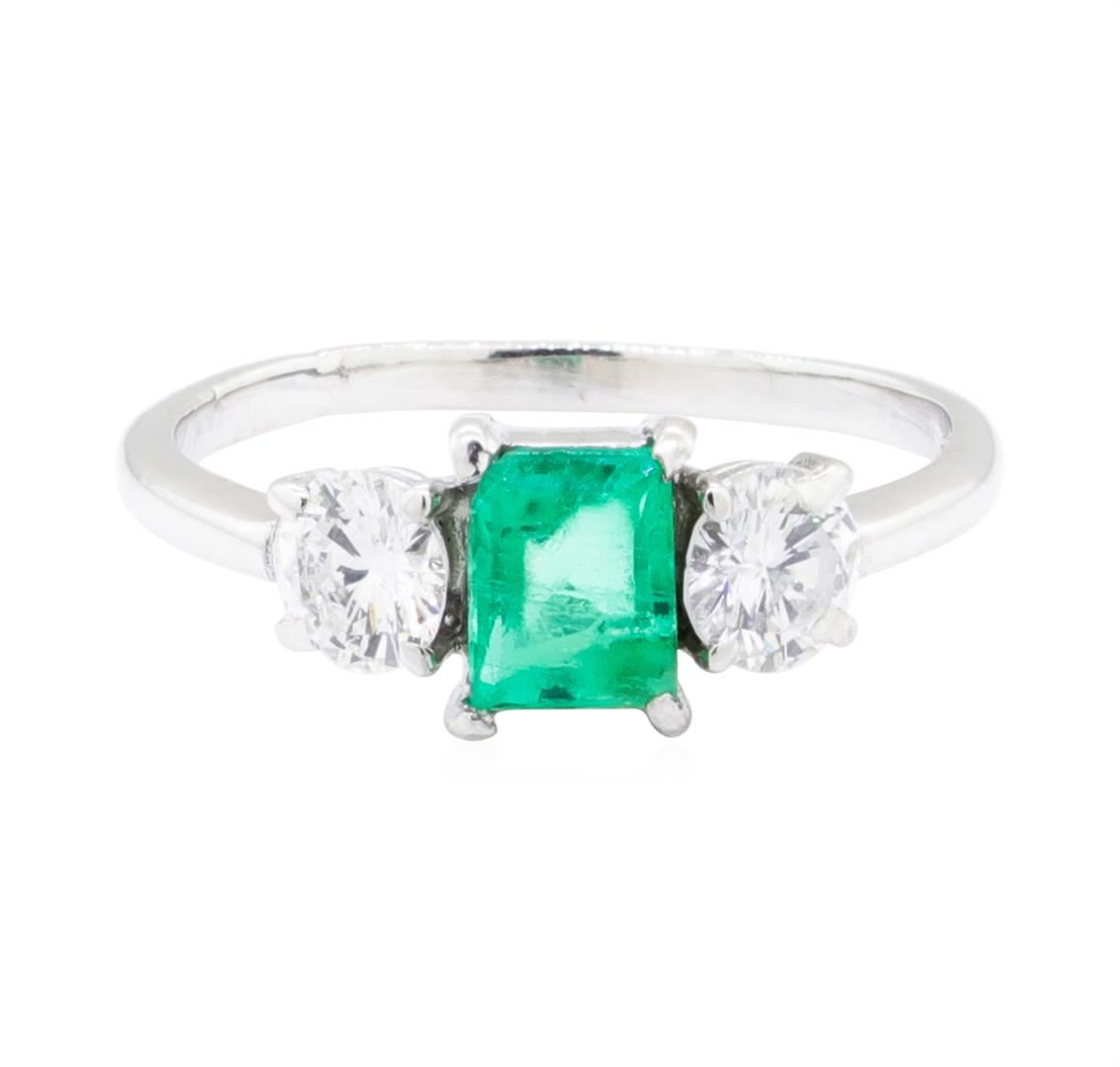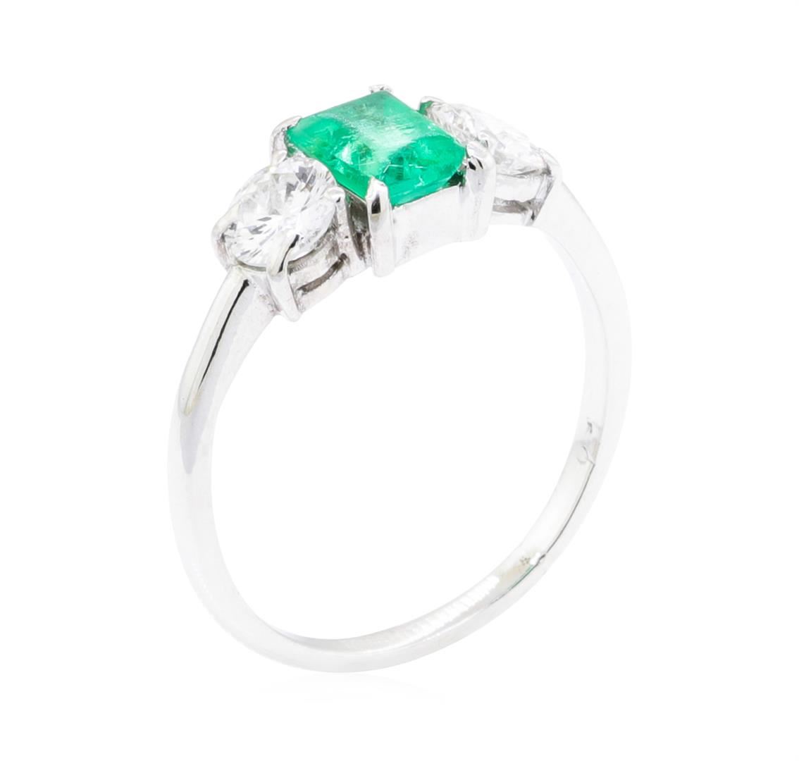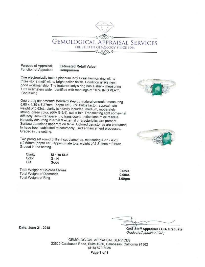One electronically tested platinum lady's cast fashion ring with a three stone motif with a bright polish finish. The featured lady's ring has a shank measuring 1.51 millimeters wide. Identified with markings of '10%. IRID PLAT'. Condition is like new, good workmanship. Containing: One prong set emerald standard step cut natural emerald, measuring 5.60 x 4.30 x 3.27mm, (depth est.) 5%. bulge factor, approximate weight of 0.62ct., clarity is heavily included, medium, moderately strong, green color, (GIA G 5/4), cut is fair. Transmitting light somewhat diffusely, semi-transparent to translucent. Indications of oil residue. Naturally occurring internal & external characteristics are present. Surface abrasions apparent on table. Colored gemstones are presumed to have been subjected to commonly used enhancement processes. Graded in the setting. Two prong set round brilliant cut diamonds, measuring 4.37 - 4.28 x 2.65mm (depth est.) approximate total weight of 2 Stones = 0.60ct. Graded in the setting. Color G - H Clarity SI-1 to SI-2 Cut Good. Total Weight of Colored Stones 0.62ct. Total Weight of Diamonds 0.60ct. Total Weight of Ring 3.00gm. GAS Appraised.