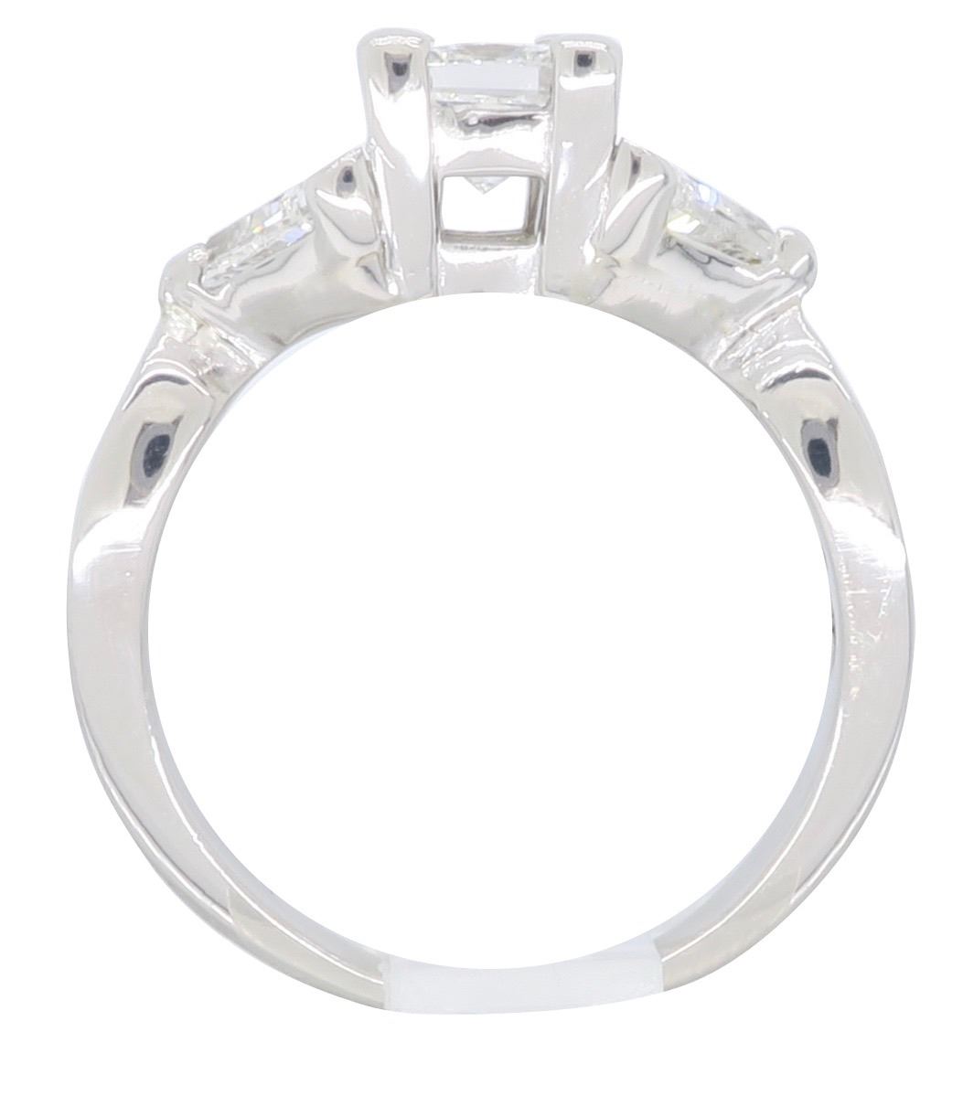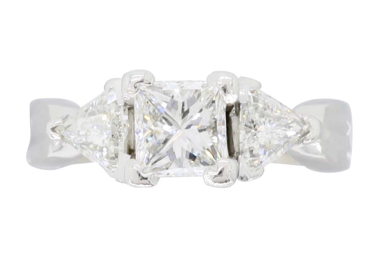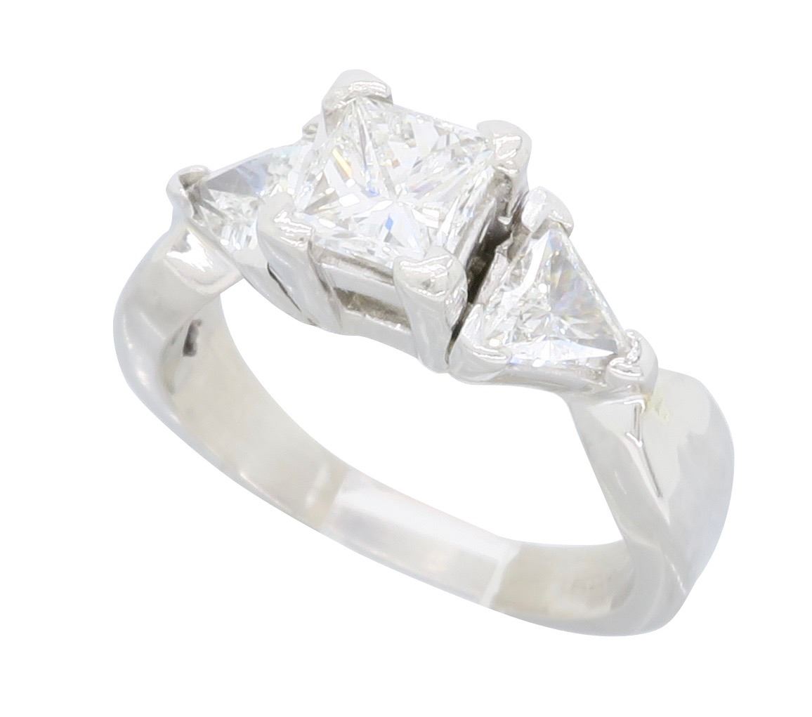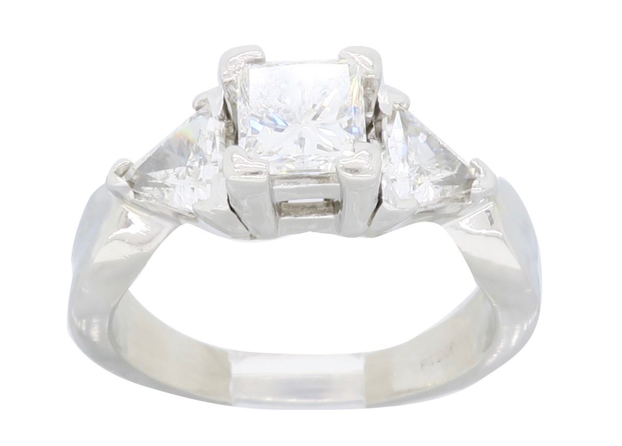 One Platinum 1.24ctw Diamond Ring. (1) Princess cut Diamond with a total weight of 0.70cts with a color of H-I and clarity of VS-2. (2) side Diamonds with a total weight of 0.54cts. Total weight of this ring is 7.4 grams.