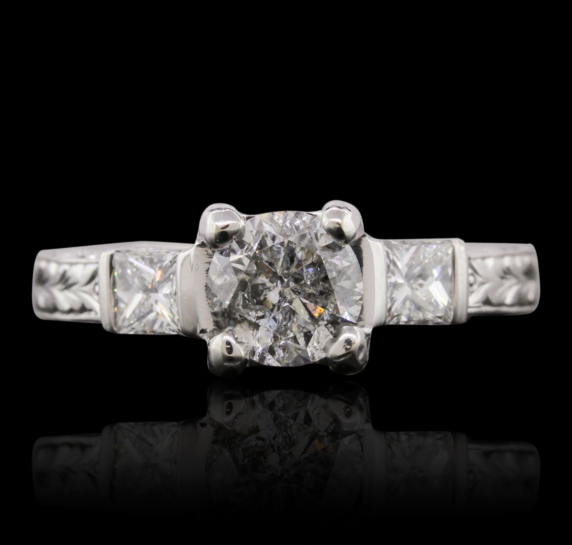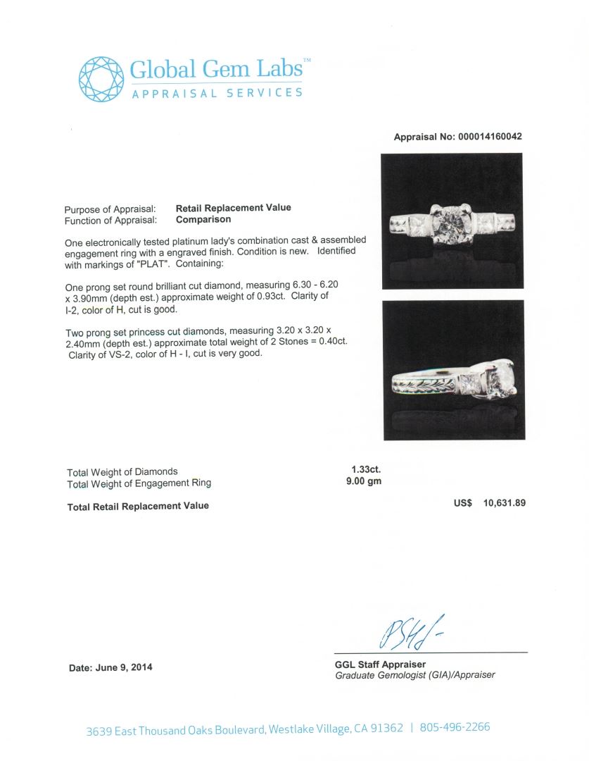 One electronically tested platinum Ladies combination cast & assembled engagement ring with a engraved finish. Condition is new. Identified with markings of "PLAT". Containing: One prong set round brilliant cut diamond, measuring 6.30 - 6.20 x 3.90mm (depth est.) approximate weight of 0.93ct. Clarity: I-2. Color: H, Cut is Good. Two prong set princess cut diamonds, measuring 3.20 x 3.20 x 2.40mm (depth est.) approximate. Total Weight of 2 Stones = 0.40ct. Clarity: VS-2. Color: H - I, Cut is Very Good. Total Weight of Diamonds 1.33ct. Total Weight of Engagement Ring 9.00 grams. GGL Appraised at $10,631.89.