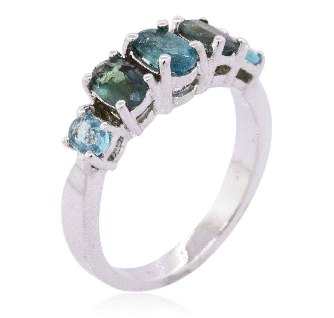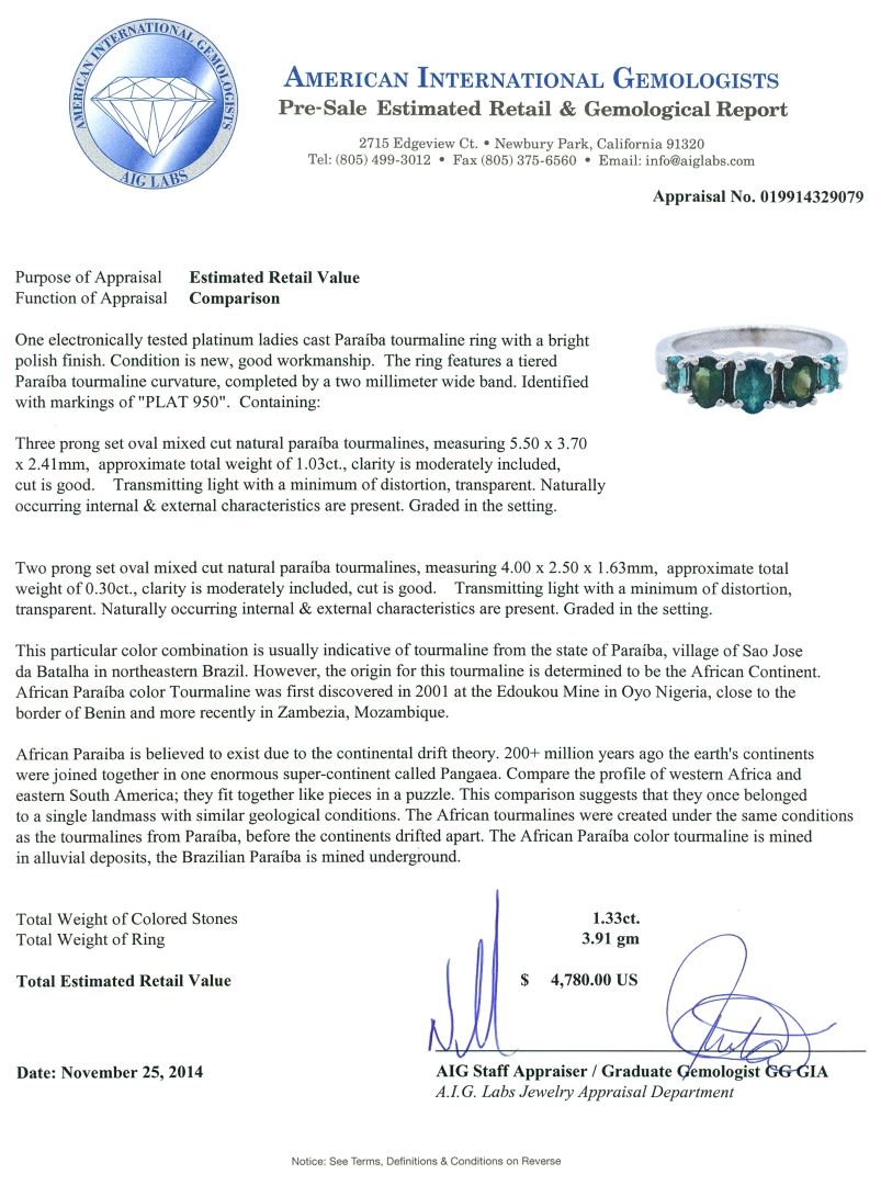 One electronically tested platinum ladies cast Paraiba tourmaline ring with a bright polish finish. The ring features a tiered Paraiba tourmaline curvature, completed by a two millimeter wide band. Identified with markings of "PLAT 950". Condition is new, good workmanship. Containing: Three prong set oval mixed cut natural Paraiba tourmalines, measuring 5.50 x 3.70 x 2.41mm, approximate total weight of 1.03ct., clarity is moderately included, cut is good. Transmitting light with a minimum of distortion, transparent. Naturally occurring internal & external characteristics are present. Graded in the setting. Two prong set oval mixed cut natural Paraiba tourmalines, measuring 4.00 x 2.50 x 1.63mm, approximate total weight of 0.30ct., clarity is moderately included, cut is good. Transmitting light with a minimum of distortion, transparent. Naturally occurring internal & external characteristics are present. Graded in the setting. This particular color combination is usually indicative of tourmaline from the state of Paraiba, village of Sao Jose da Batalha in northeastern Brazil. However, the origin for this tourmaline is determined to be the African Continent. African Paraiba color Tourmaline was first discovered in 2001 at the Edoukou Mine in Oyo Nigeria, close to the border of Benin and more recently in Zambezia, Mozambique. African Paraiba is believed to exist due to the continental drift theory. 200+ million years ago the earth's continents were joined together in one enormous super-continent called Pangaea. Compare the profile of western Africa and eastern South America; they fit together like pieces in a puzzle. This comparison suggests that they once belonged to a single landmass with similar geological conditions. The African tourmalines were created under the same conditions as the tourmalines from Paraiba, before the continents drifted apart. The African Paraiba color tourmaline is mined in alluvial deposits, the Brazilian Paraiba is mined underground. Total Weight of Colored Stones 1.33ct. Total Weight of Ring 3.91 grams. AIG Appraised at $4,780.00.