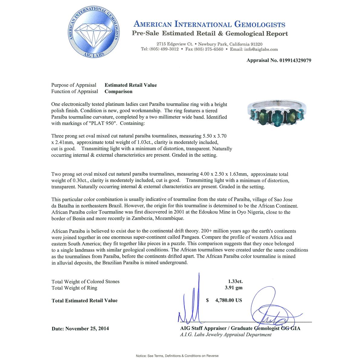 One electronically tested platinum ladies cast Paraiba tourmaline ring with a bright polish finish. The ring features a tiered Paraiba tourmaline curvature, completed by a two millimeter wide band. Identified with markings of "PLAT 950". Condition is new, good workmanship. Containing: Three prong set oval mixed cut natural Paraiba tourmalines, measuring 5.50 x 3.70 x 2.41mm, approximate total weight of 1.03ct., clarity is moderately included, cut is good. Transmitting light with a minimum of distortion, transparent. Naturally occurring internal & external characteristics are present. Graded in the setting. Two prong set oval mixed cut natural Paraiba tourmalines, measuring 4.00 x 2.50 x 1.63mm, approximate total weight of 0.30ct., clarity is moderately included, cut is good. Transmitting light with a minimum of distortion, transparent. Naturally occurring internal & external characteristics are present. Graded in the setting. This particular color combination is usually indicative of tourmaline from the state of Paraiba, village of Sao Jose da Batalha in northeastern Brazil. However, the origin for this tourmaline is determined to be the African Continent. African Paraiba color Tourmaline was first discovered in 2001 at the Edoukou Mine in Oyo Nigeria, close to the border of Benin and more recently in Zambezia, Mozambique. African Paraiba is believed to exist due to the continental drift theory. 200+ million years ago the earth's continents were joined together in one enormous super-continent called Pangaea. Compare the profile of western Africa and eastern South America; they fit together like pieces in a puzzle. This comparison suggests that they once belonged to a single landmass with similar geological conditions. The African tourmalines were created under the same conditions as the tourmalines from Paraiba, before the continents drifted apart. The African Paraiba color tourmaline is mined in alluvial deposits, the Brazilian Paraiba is mined underground. Total Weight of Colored Stones 1.33ct. Total Weight of Ring 3.91 grams. AIG Appraised at $4,780.00.