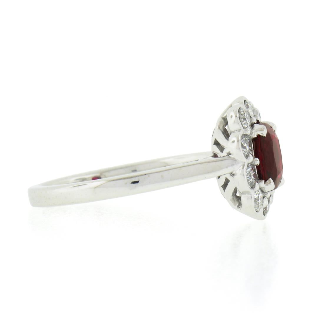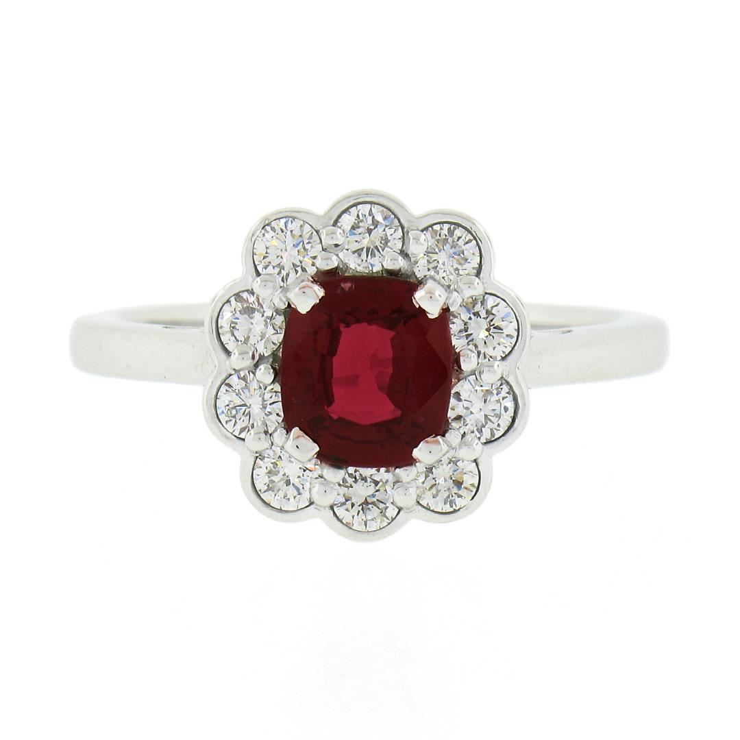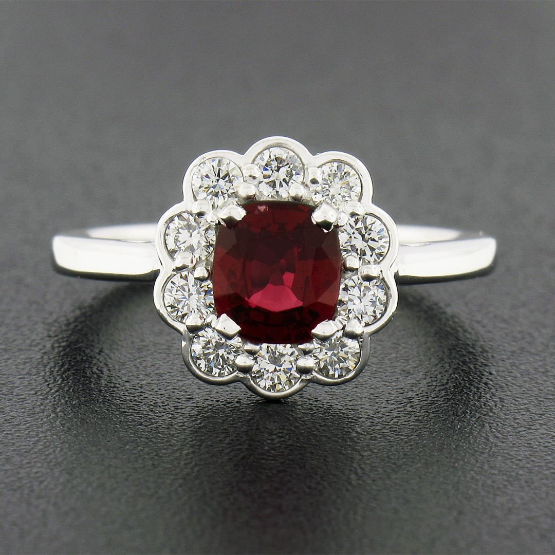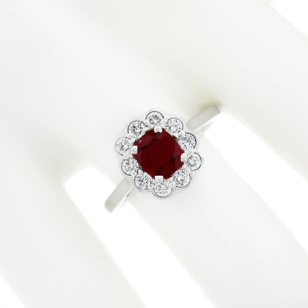 A new solid platinum ring, with 1 GIA graded cushion cut natural spinel (0.92ct ), surrounded with a halo of 10 round cut natural diamonds (G/H - VS1/VS2 ; 0.43ctw). The ring is size 6.5, weighs a total of 5.43 grams, and measures 11.55mm wide. Comes with all original relevant certifications.