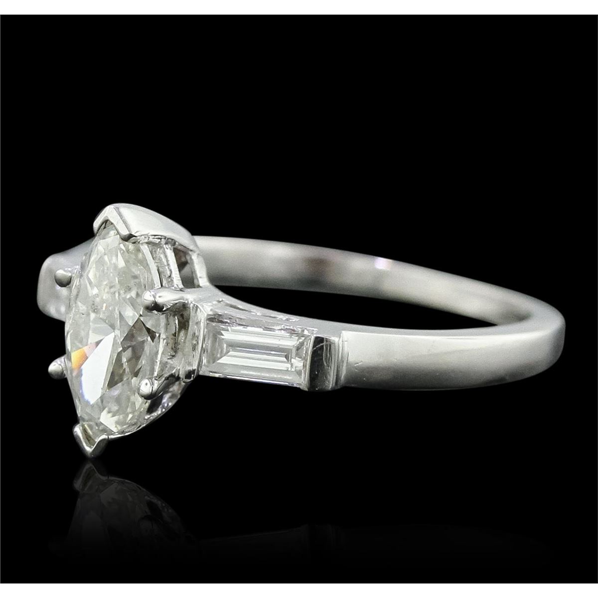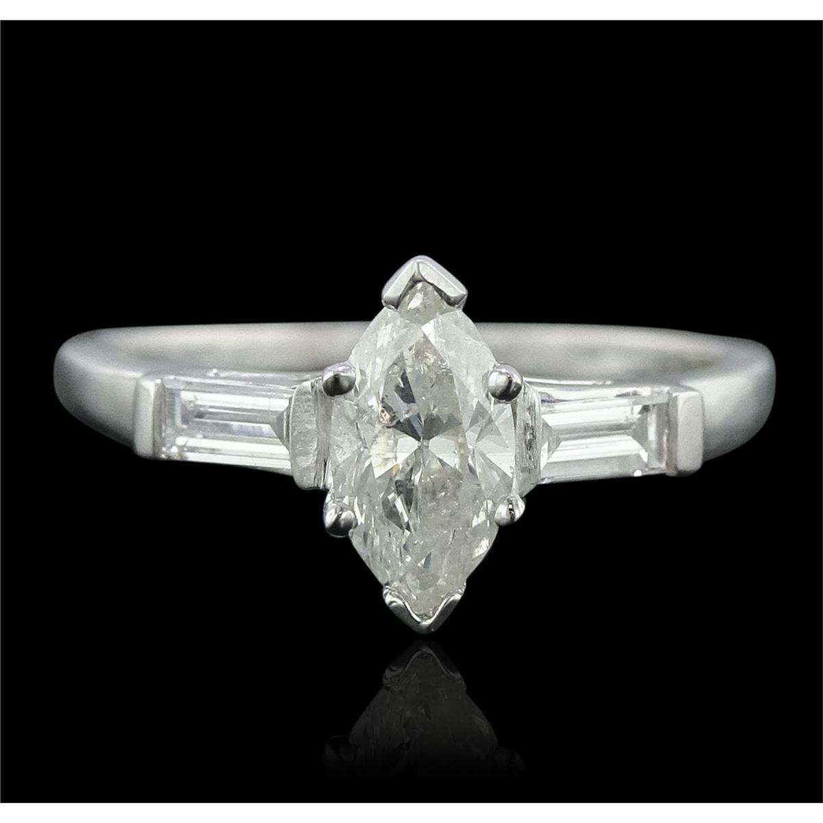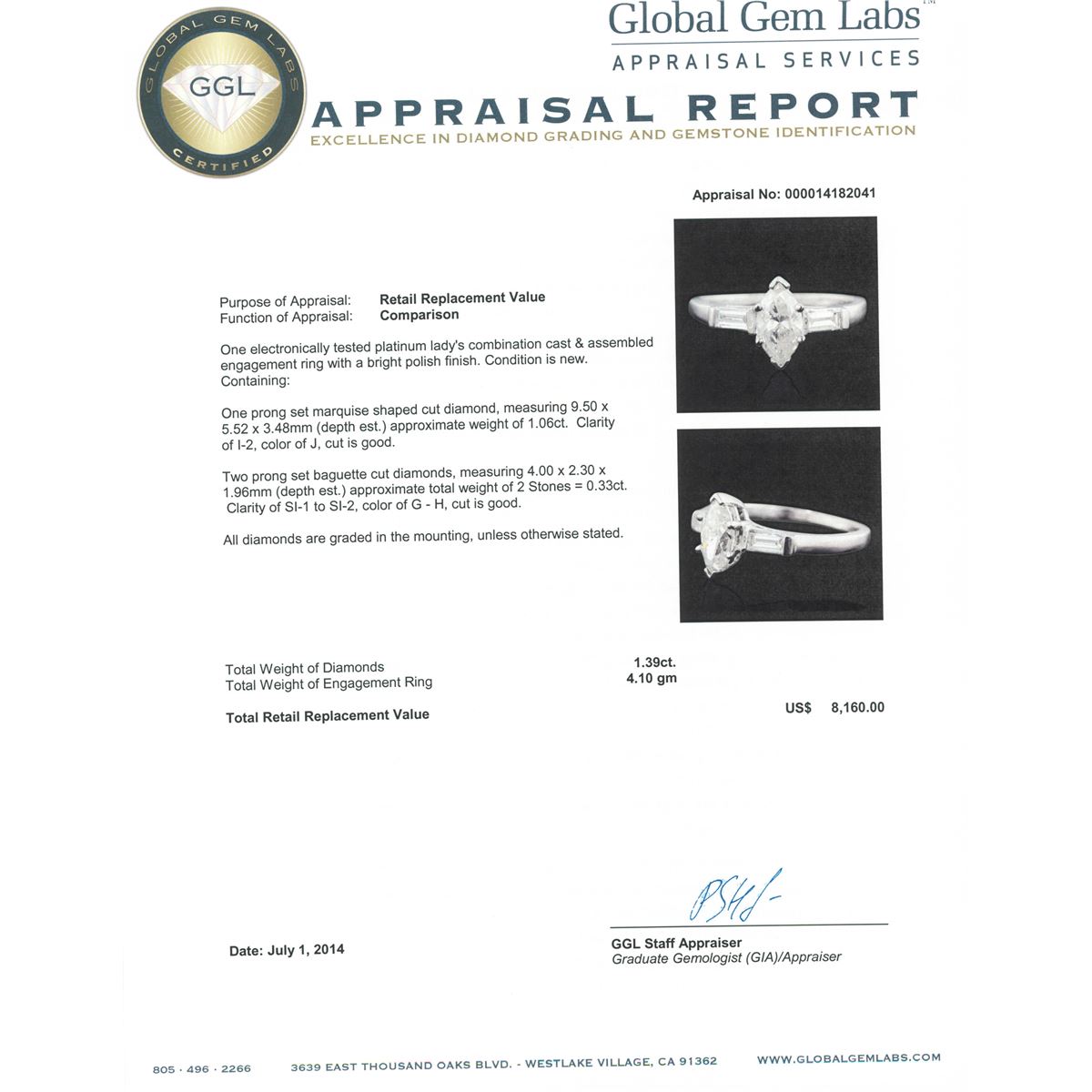 One electronically tested platinum Ladies combination cast & assembled engagement ring with a bright polish finish. Condition is new. Containing: One prong set marquise shaped cut diamond, measuring 9.50 x 5.52 x 3.48mm (depth est.) approximate weight of 1.06ct. Clarity: I-2. Color: J, Cut is Good. Two prong set baguette cut diamonds, measuring 4.00 x 2.30 x 1.96mm (depth est.) approximate total weight of 2 Stones = 0.33ct. Clarity: SI-1 to SI-2. Color: G - H, Cut is Good. All diamonds are graded in the mounting, unless otherwise stated. Total Weight of Diamonds 1.39ct. Total Weight of Engagement Ring 4.10 grams. GGL Appraised at $8,160.00.