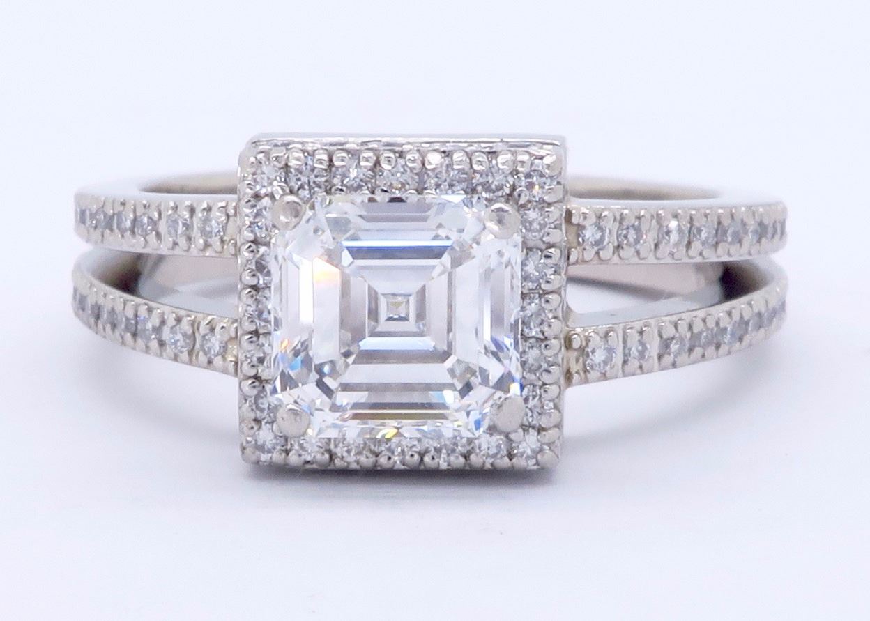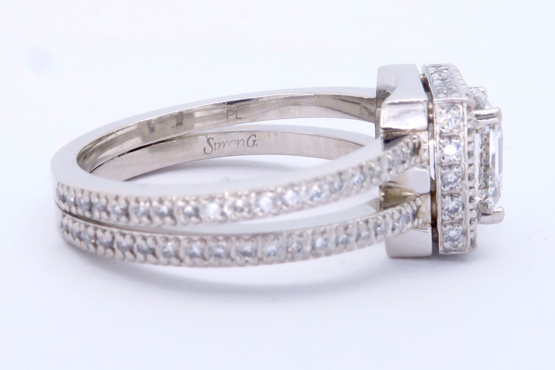One Platinum 1.41ctw GIA Cert Diamond Ring. (1) GIA Certified square emerald cut Diamond with a total weight of 1.11cts with a color of E and clarity of VS-1. Round side Diamonds with a total weight of 0.30cts. Total weight of this ring is 7.1 grams. Ring size is a 5.