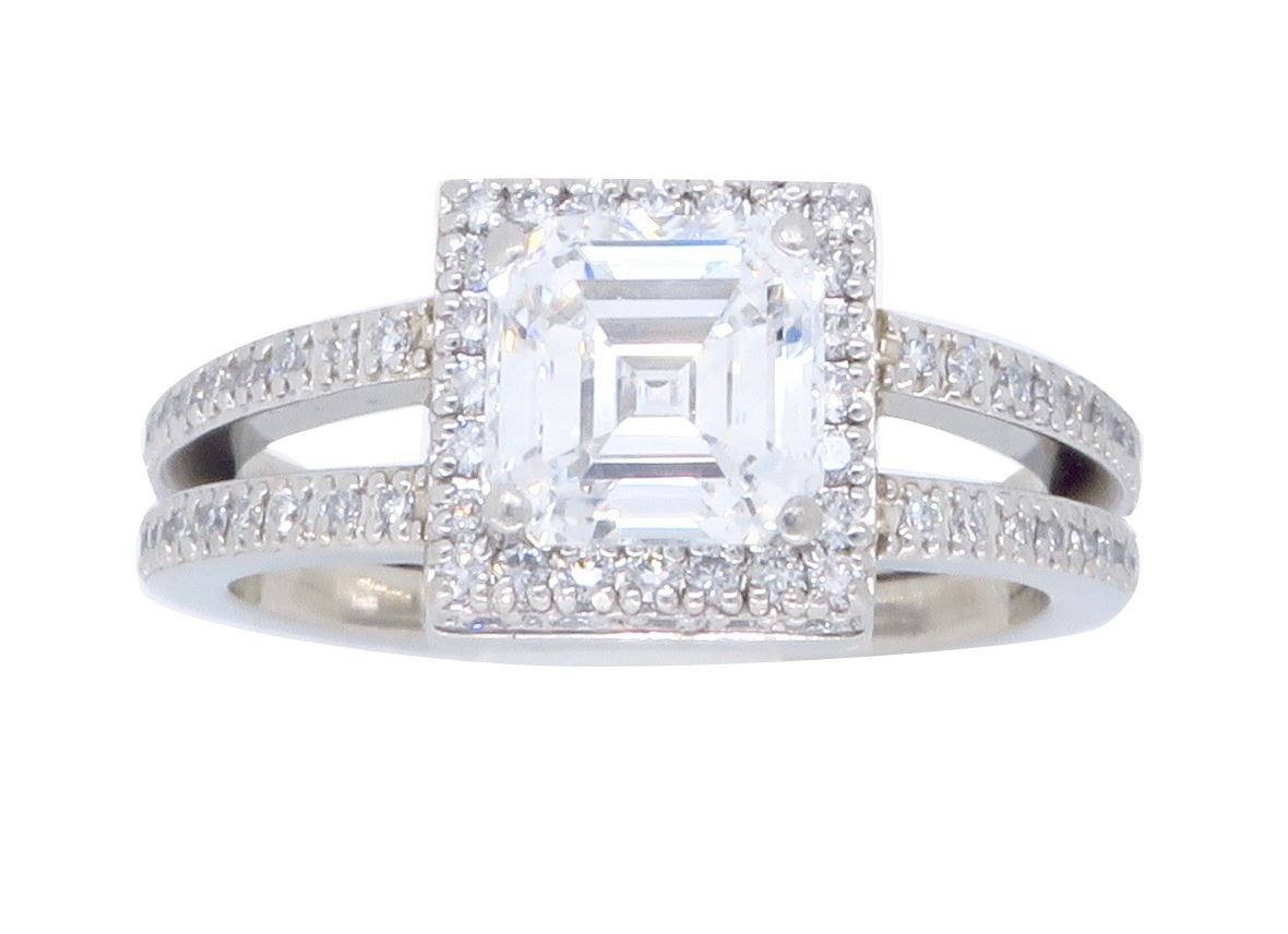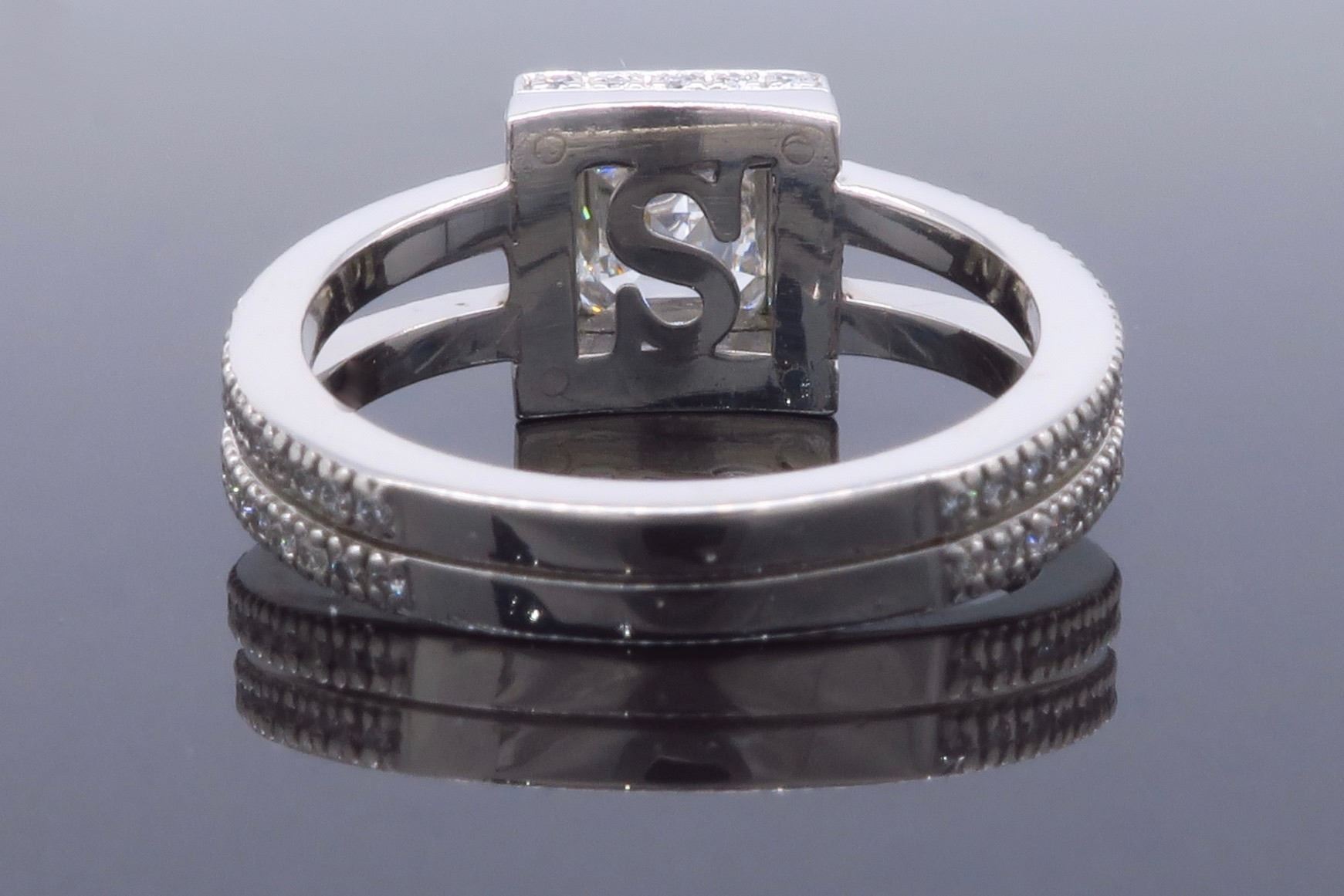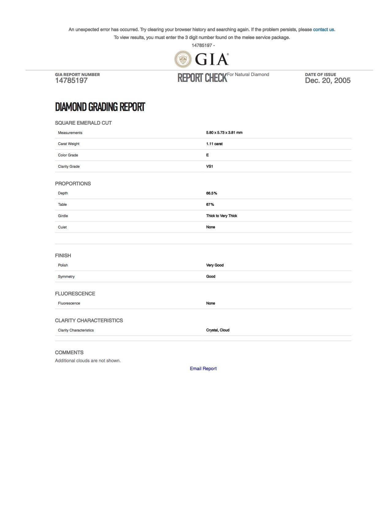 One Platinum 1.41ctw GIA Cert Diamond Ring. (1) GIA Certified square emerald cut Diamond with a total weight of 1.11cts with a color of E and clarity of VS-1. Round side Diamonds with a total weight of 0.30cts. Total weight of this ring is 7.1 grams. Ring size is a 5.