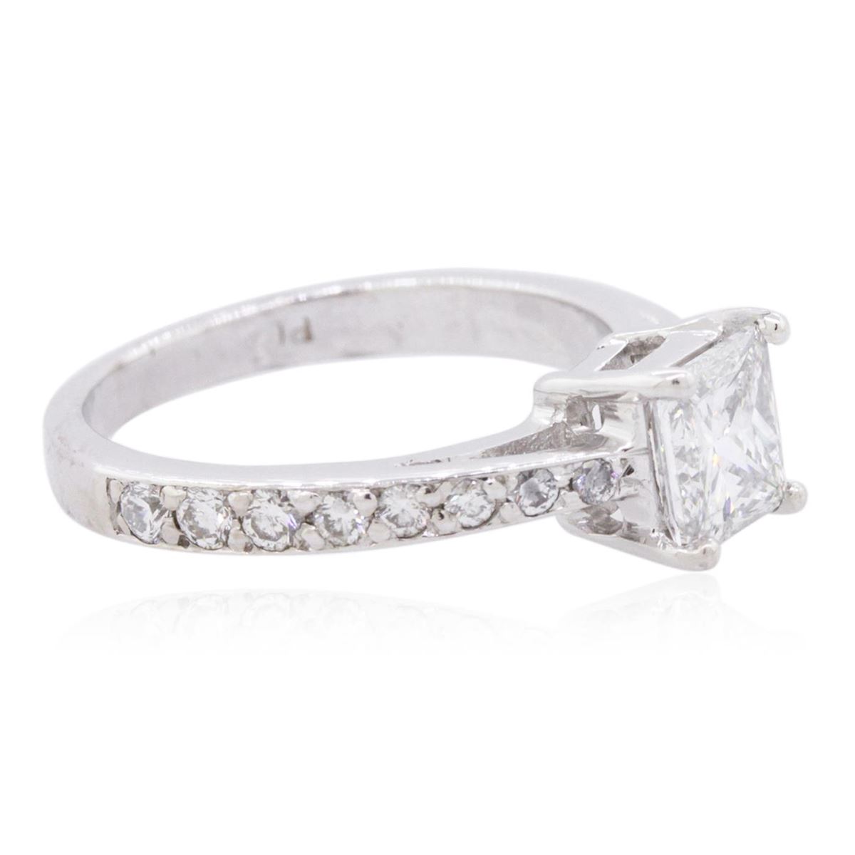 One electronically tested platinum ladies cast diamond unity ring with a bright polish finish. The featured diamond is supported by diamond set shoulders, completed by a two millimeter wide band. Identified with markings of "PLAT". Condition is good. Containing: One prong set princess cut diamond, measuring 5.50 x 5.30 x 3.75mm (depth est.), 6.00.%. GTCF approximate weight of 1.05ct. Graded in the setting. Clarity: I-1. Color: 70.8%. Table 80.2%. Sixteen prong set round brilliant cut diamonds, measuring 1.90 - 1.50 x 1.02mm (depth est.) approximate total weight of 16 Stones = 0.38ct. Graded in the setting. Clarity: VS-2 to SI-1. Color: H - J. Total Weight of Diamonds 1.43ct. Total Weight of Ring 5.43 grams. AIG Appraised at $13,610.00.