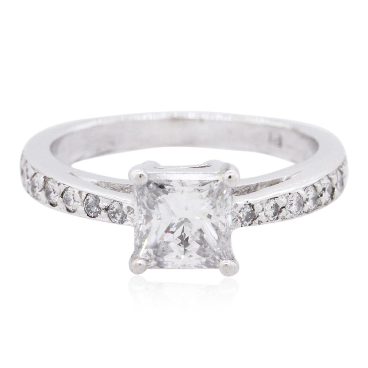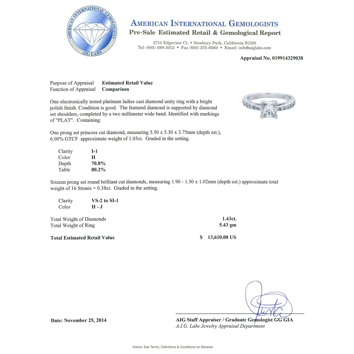 One electronically tested platinum ladies cast diamond unity ring with a bright polish finish. The featured diamond is supported by diamond set shoulders, completed by a two millimeter wide band. Identified with markings of "PLAT". Condition is good. Containing: One prong set princess cut diamond, measuring 5.50 x 5.30 x 3.75mm (depth est.), 6.00.%. GTCF approximate weight of 1.05ct. Graded in the setting. Clarity: I-1. Color: 70.8%. Table 80.2%. Sixteen prong set round brilliant cut diamonds, measuring 1.90 - 1.50 x 1.02mm (depth est.) approximate total weight of 16 Stones = 0.38ct. Graded in the setting. Clarity: VS-2 to SI-1. Color: H - J. Total Weight of Diamonds 1.43ct. Total Weight of Ring 5.43 grams. AIG Appraised at $13,610.00.