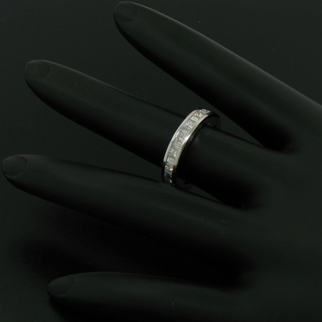 A like new platinum band ring channel set with 1.45ctw of alternating princess and baguette cut diamonds (E/F - VVS2/VS1). The ring is size 4.5, weighs a total of 6.39 grams, and measures 3.95mm wide.