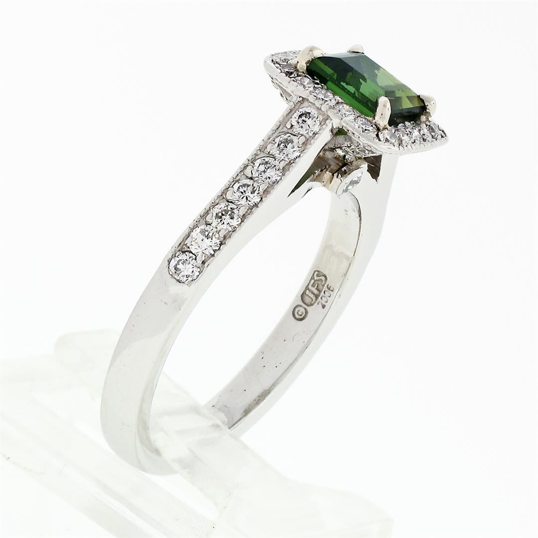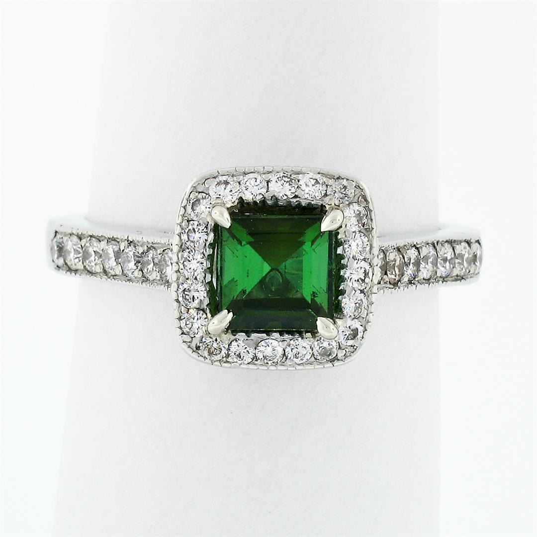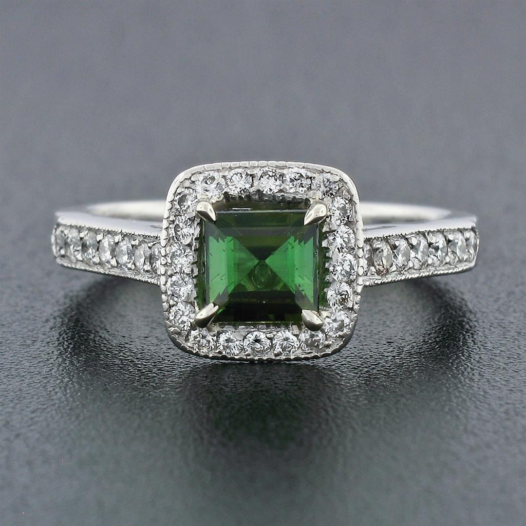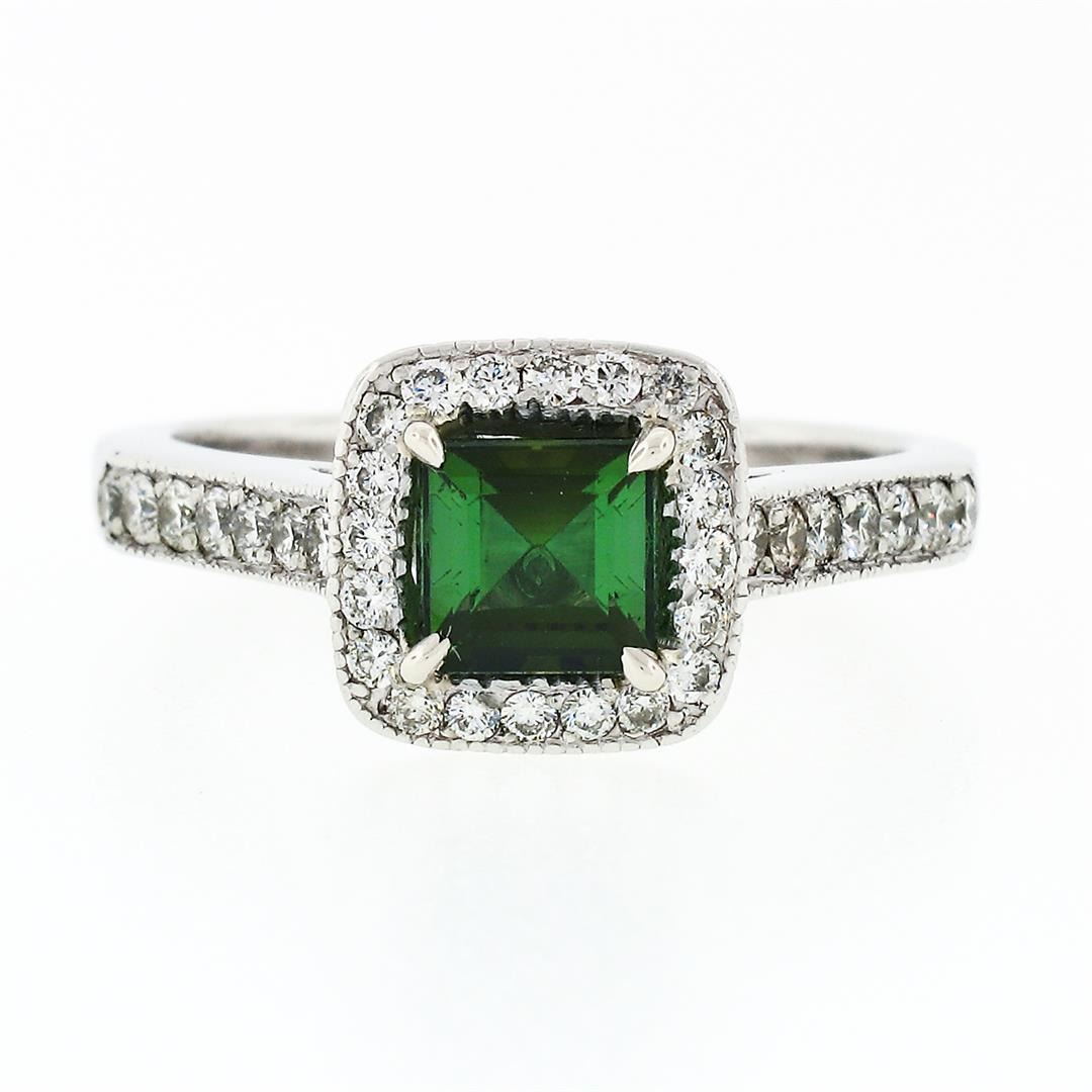 A solid platinum solitaire engagement ring, with 1 square step cut natural tourmaline (5.25mm; 0.85ct), surrounded with a halo of 50 round brilliant cut natural diamonds (G/H - VS1/VS2; 0.62ctw), and 2 square princess cut natural diamonds (G - VS1; 0.04ctw). The ring is size 6.0, weighs a total of 6.17 grams, and measures 9.15mm wide.