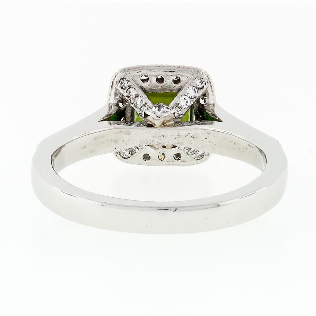A solid platinum solitaire engagement ring, with 1 square step cut natural tourmaline (5.25mm; 0.85ct), surrounded with a halo of 50 round brilliant cut natural diamonds (G/H - VS1/VS2; 0.62ctw), and 2 square princess cut natural diamonds (G - VS1; 0.04ctw). The ring is size 6.0, weighs a total of 6.17 grams, and measures 9.15mm wide.
