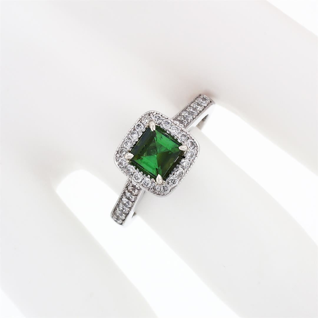A solid platinum solitaire engagement ring, with 1 square step cut natural tourmaline (5.25mm; 0.85ct), surrounded with a halo of 50 round brilliant cut natural diamonds (G/H - VS1/VS2; 0.62ctw), and 2 square princess cut natural diamonds (G - VS1; 0.04ctw). The ring is size 6.0, weighs a total of 6.17 grams, and measures 9.15mm wide.