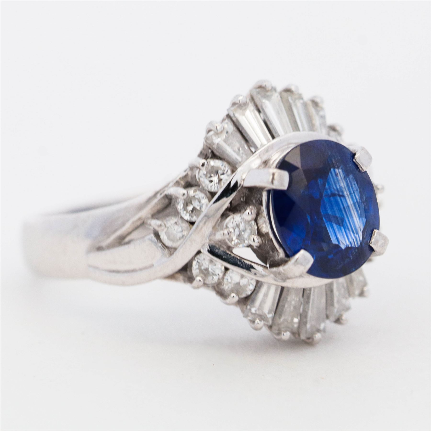 A fantastic and substantial platinum (900) ring showing a richly hued 1& frac12;-carat natural sapphire centre with a delightful sunburst of baguette and round diamond rays.& nbsp;