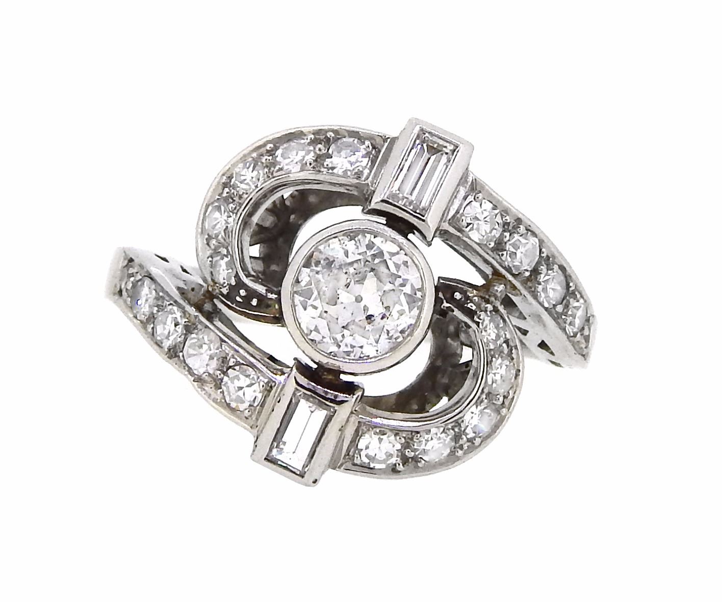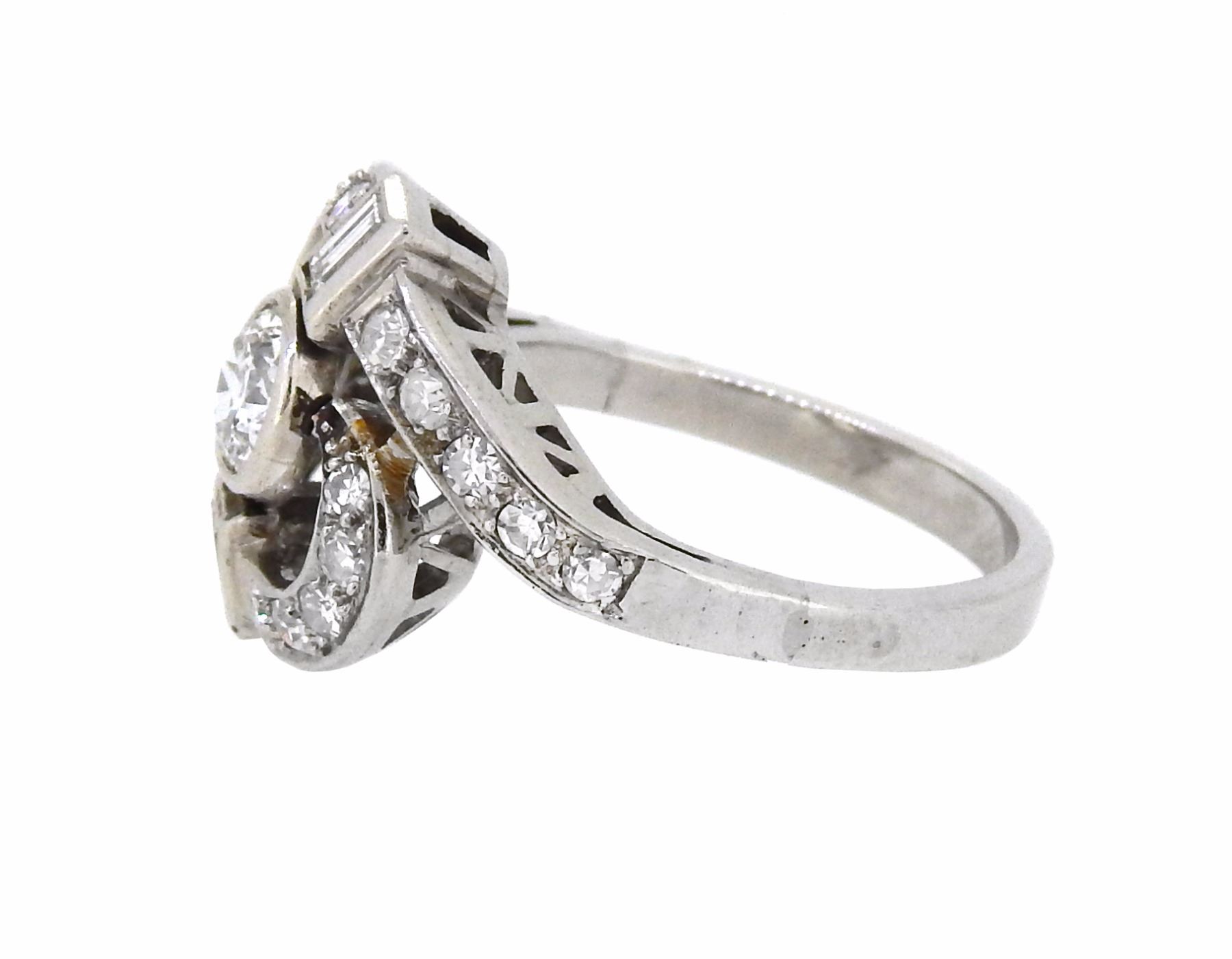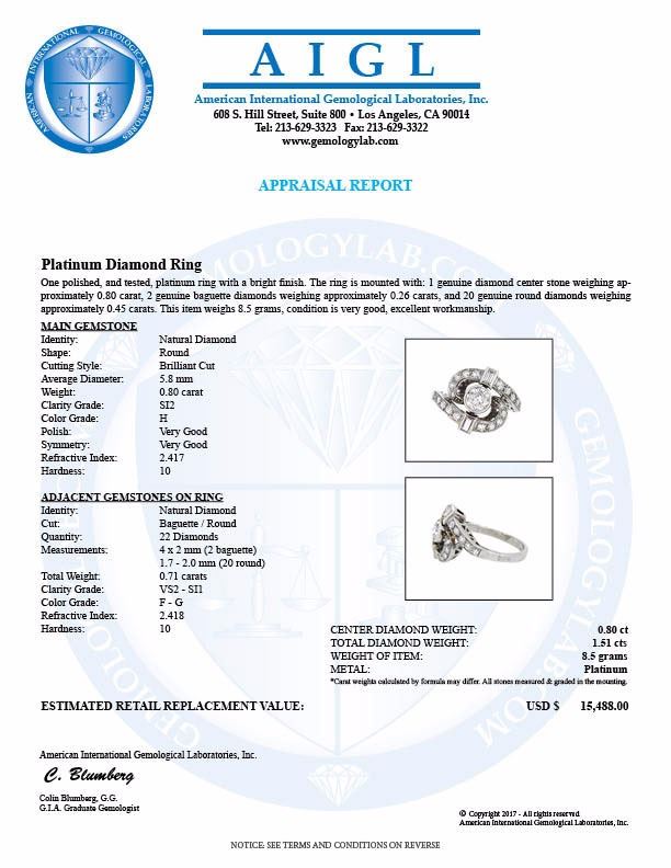 One Platinum 1.51ctw Diamond Ring. (1) Center Diamond with a total weight of 0.80cts with a color of H and clarity of SI-2. (22) Side Diamonds with a total weight of 0.71cts with a color of F-G and clarity of VS-2 to SI-1. Total weight of this ring is 8.5 grams.