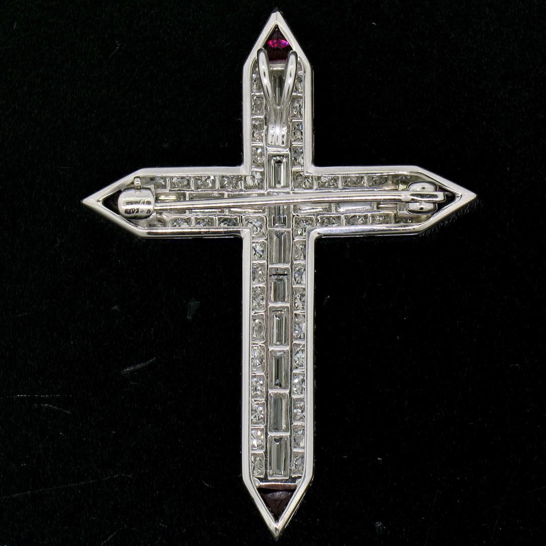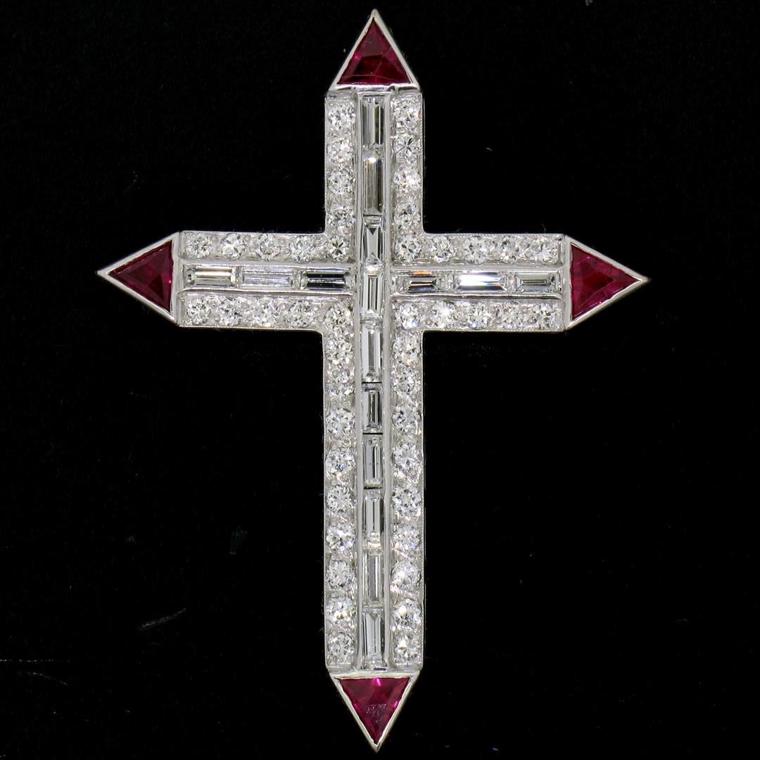 One Platinum 1.56ctw Round Baguette Diamond & Trillion Ruby Cross Pendant Pin Brooch. Item Details: Material: Solid Platinum, Weight: 6.67 Grams, Stone(s): (46) Natural Genuine Diamonds - Round Transitional Cut - Pave Set - VS1 Clarity - E/F Color - 0.92ctw (approx.), (16) Natural Genuine Diamonds - Baguette Cut - Channel Set - VVS2/VS1 Clarity - E/F Color - 0.64ctw (approx.), (4) Synthetic Rubies - Trillion Faceted Cut - Bezel Set - Vivid and Rich Wine Red Color, Total Carat Weight: 1.56ctw (approx.), Chain Type: Not Included, Width: 32.35mm (1.27") Height (w/ Bail): 43.3mm (1.70") Inside Bail Measurements: 1.65x3.5mm Condition: Vintage piece. Like new condition and ready to wear!