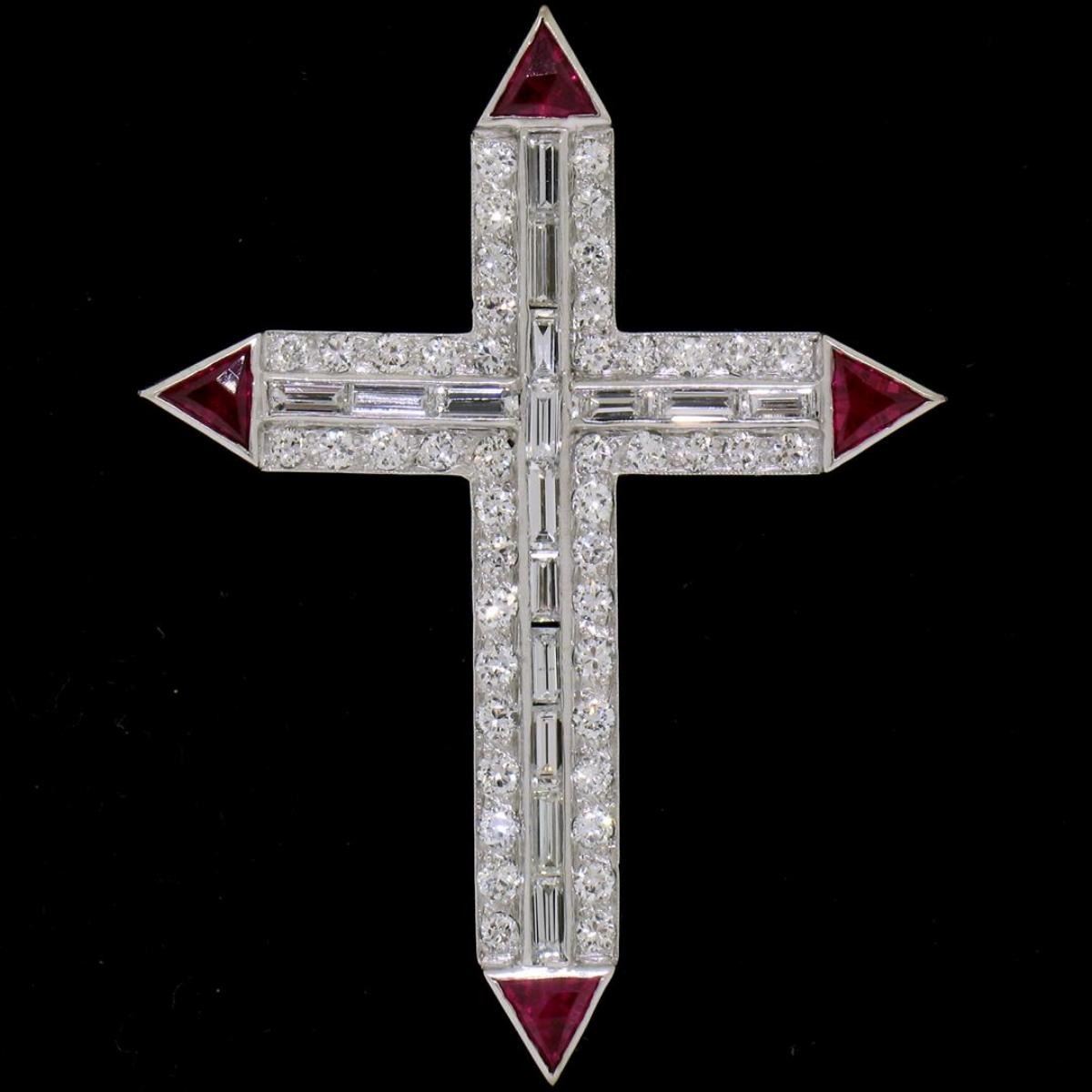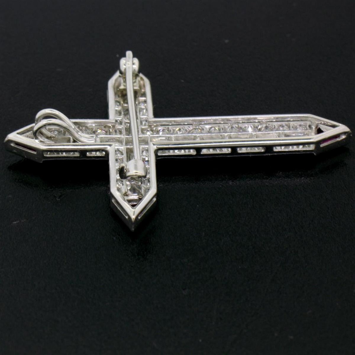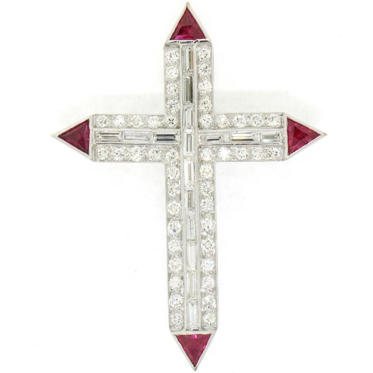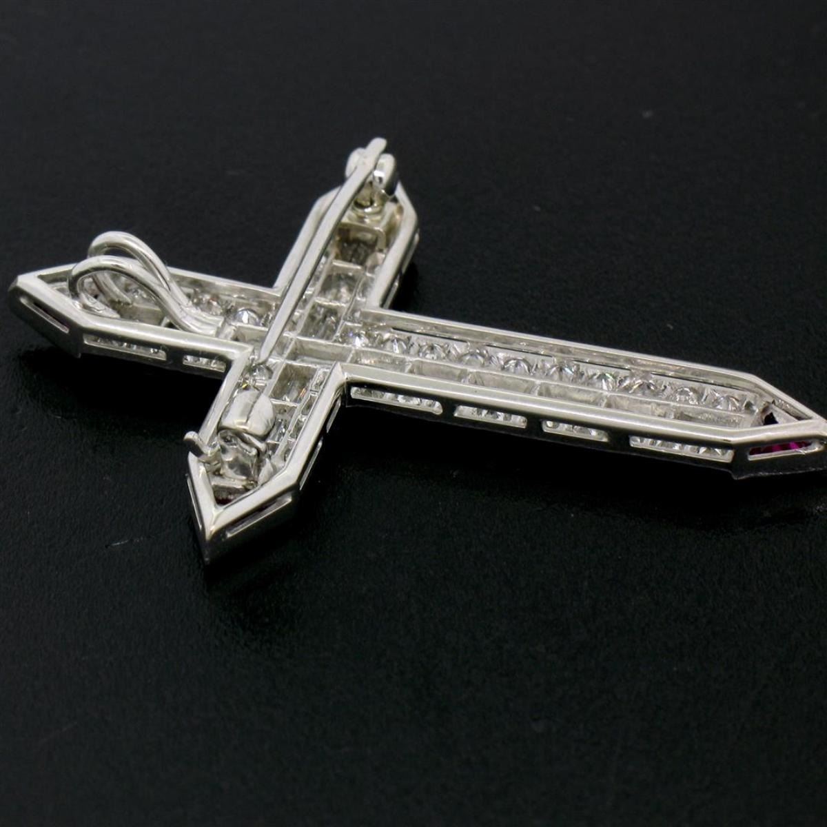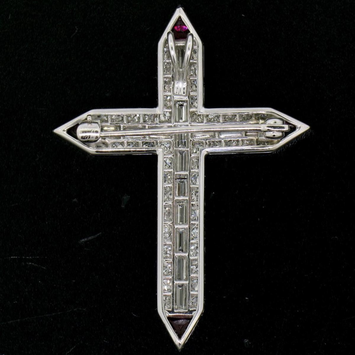 One Platinum 1.56ctw Round Baguette Diamond & Trillion Ruby Cross Pendant Pin Brooch. Item Details: Material: Solid Platinum, Weight: 6.67 Grams, Stone(s): (46) Natural Genuine Diamonds - Round Transitional Cut - Pave Set - VS1 Clarity - E/F Color - 0.92ctw (approx.), (16) Natural Genuine Diamonds - Baguette Cut - Channel Set - VVS2/VS1 Clarity - E/F Color - 0.64ctw (approx.), (4) Synthetic Rubies - Trillion Faceted Cut - Bezel Set - Vivid and Rich Wine Red Color, Total Carat Weight: 1.56ctw (approx.), Chain Type: Not Included, Width: 32.35mm (1.27") Height (w/ Bail): 43.3mm (1.70") Inside Bail Measurements: 1.65x3.5mm Condition: Vintage piece. Like new condition and ready to wear!