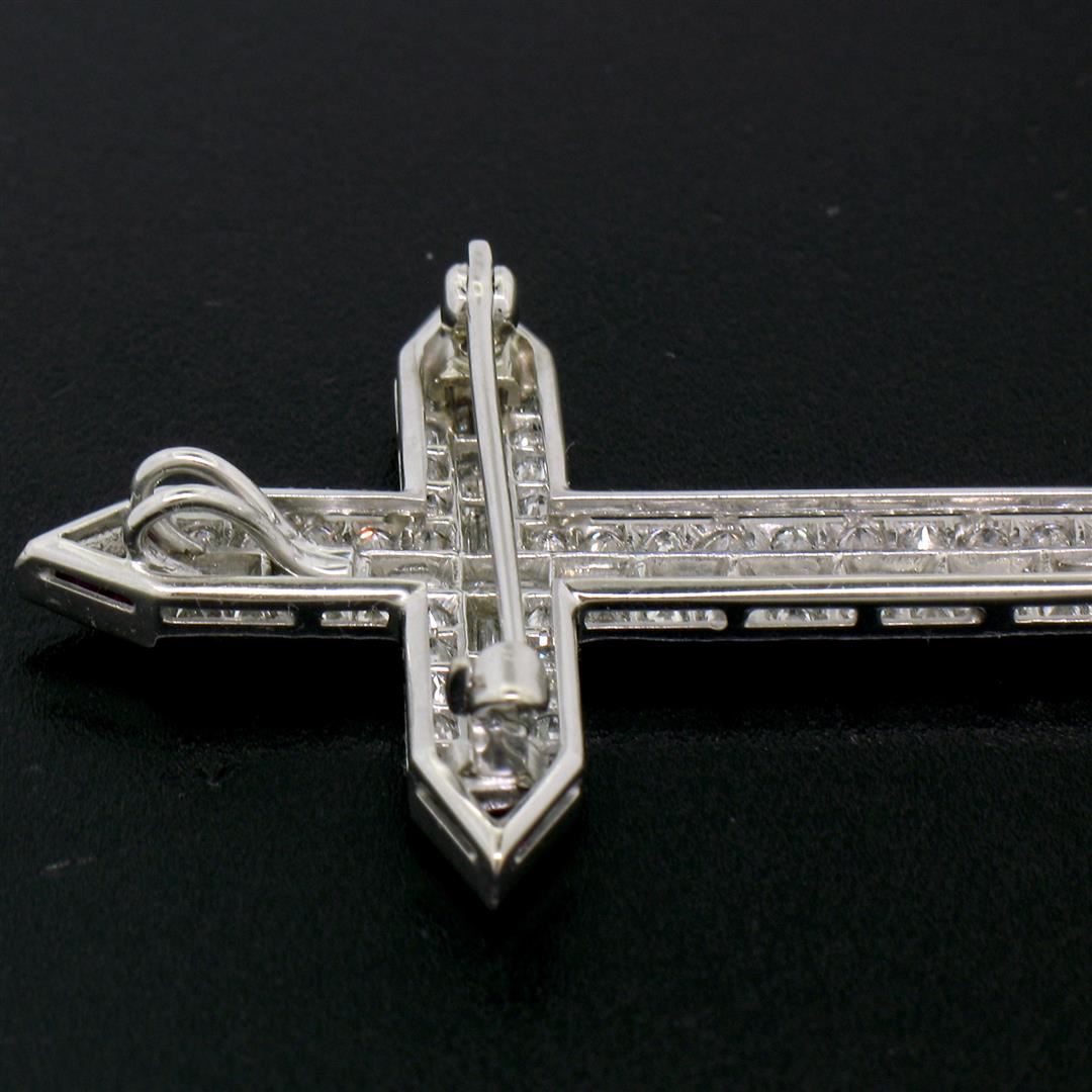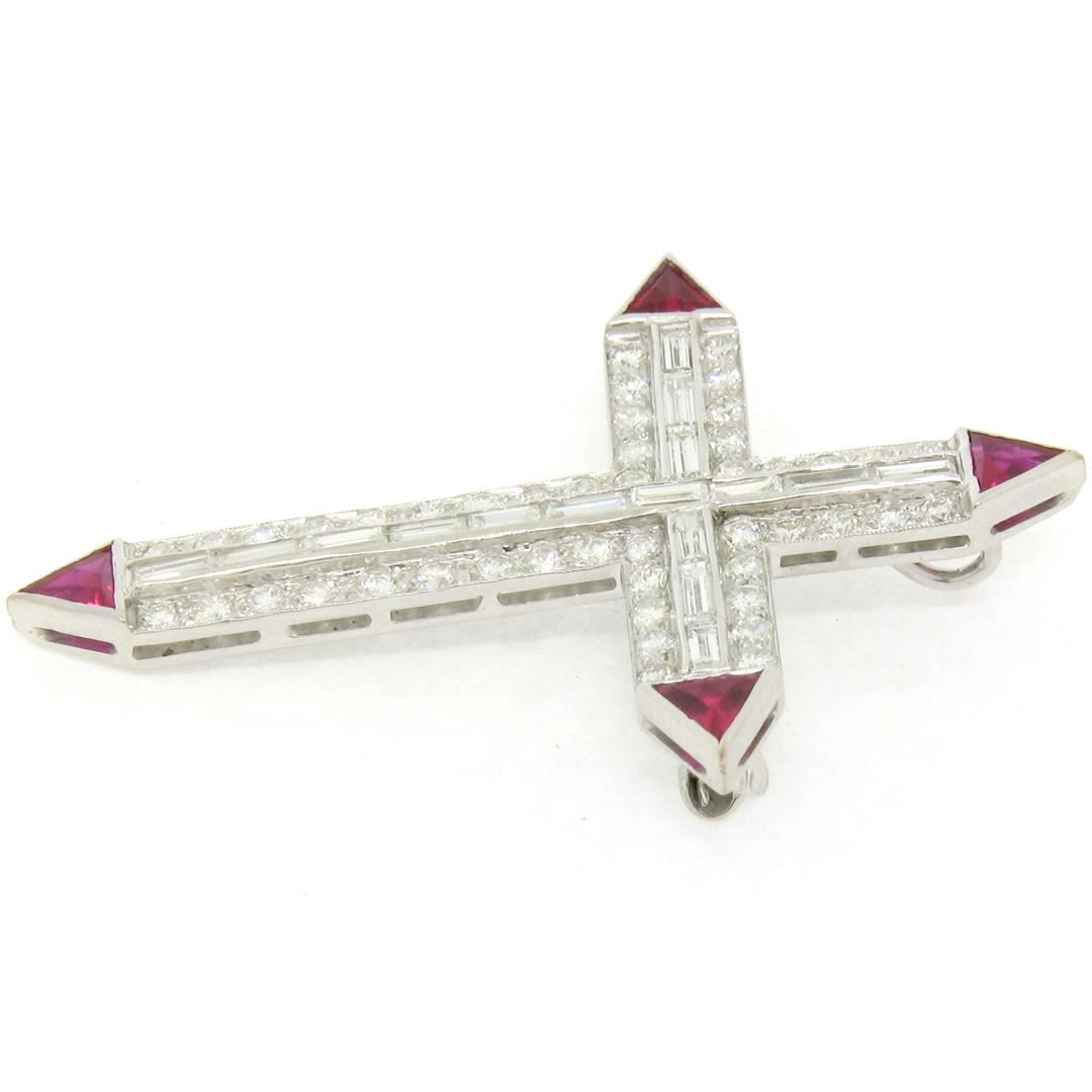 One Platinum 1.56ctw Round Baguette Diamond & Trillion Ruby Cross Pendant Pin Brooch. Item Details: Material: Solid Platinum, Weight: 6.67 Grams, Stone(s): (46) Natural Genuine Diamonds - Round Transitional Cut - Pave Set - VS1 Clarity - E/F Color - 0.92ctw (approx.), (16) Natural Genuine Diamonds - Baguette Cut - Channel Set - VVS2/VS1 Clarity - E/F Color - 0.64ctw (approx.), (4) Synthetic Rubies - Trillion Faceted Cut - Bezel Set - Vivid and Rich Wine Red Color, Total Carat Weight: 1.56ctw (approx.), Chain Type: Not Included, Width: 32.35mm (1.27") Height (w/ Bail): 43.3mm (1.70") Inside Bail Measurements: 1.65x3.5mm Condition: Vintage piece. Like new condition and ready to wear!