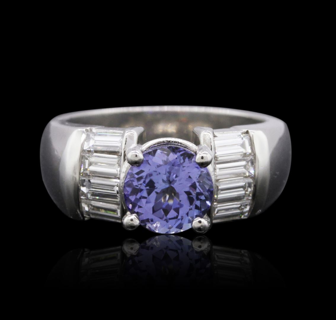 One electronically tested platinum ladies combination cast & assembled tanzanite and diamond ring with a bright polish finish. Identified with markings of "PLAT". Condition is new. Containing: One prong set round modified brilliant cut natural tanzanite, measuring 7.20 - 7.20 x 4.68 mm, approximate weight of 1.63ct., clarity is eye clean, type I, light, very slightly grayish, violet color, (GIA V 3/3), cut is very good. Eight channel set baguette cut diamonds, measuring 3.50 x 1.80 x 1.53mm (depth est.) approximate total weight of 8 Stones = 0.71ct. Clarity: VS-2. Color: G - H, Cut is Good. Colored gemstones are presumed to have been subjected to commonly used enhancement processes. All diamonds and colored gemstones are graded in the mounting, unless otherwise stated. Total Weight of Colored Stones 1.63ct. Total Weight of Diamonds 0.71ct. Total Weight of Ring 16.60 grams. GGL Appraised at $7,920.00.