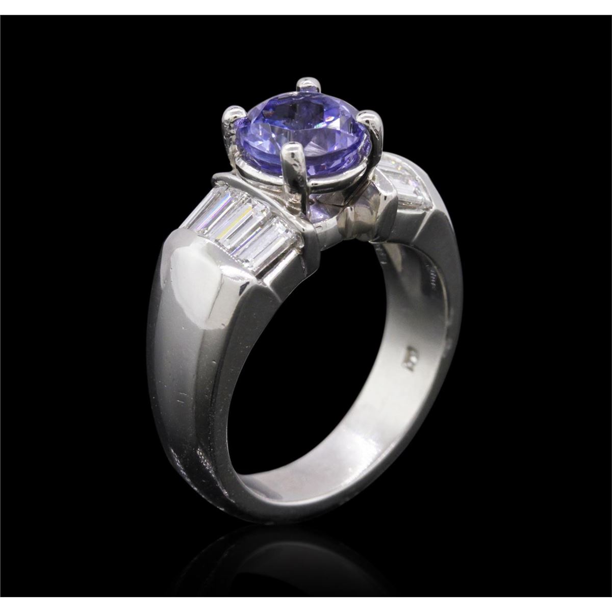 One electronically tested platinum ladies combination cast & assembled tanzanite and diamond ring with a bright polish finish. Identified with markings of "PLAT". Condition is new. Containing: One prong set round modified brilliant cut natural tanzanite, measuring 7.20 - 7.20 x 4.68 mm, approximate weight of 1.63ct., clarity is eye clean, type I, light, very slightly grayish, violet color, (GIA V 3/3), cut is very good. Eight channel set baguette cut diamonds, measuring 3.50 x 1.80 x 1.53mm (depth est.) approximate total weight of 8 Stones = 0.71ct. Clarity: VS-2. Color: G - H, Cut is Good. Colored gemstones are presumed to have been subjected to commonly used enhancement processes. All diamonds and colored gemstones are graded in the mounting, unless otherwise stated. Total Weight of Colored Stones 1.63ct. Total Weight of Diamonds 0.71ct. Total Weight of Ring 16.60 grams. GGL Appraised at $7,920.00.