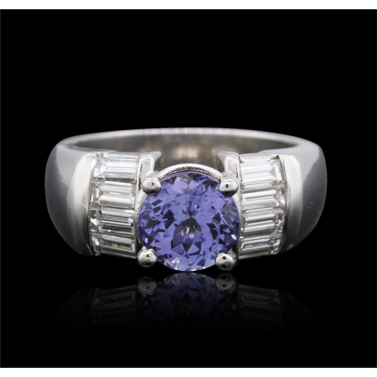 One electronically tested platinum ladies combination cast & assembled tanzanite and diamond ring with a bright polish finish. Identified with markings of "PLAT". Condition is new. Containing: One prong set round modified brilliant cut natural tanzanite, measuring 7.20 - 7.20 x 4.68 mm, approximate weight of 1.63ct., clarity is eye clean, type I, light, very slightly grayish, violet color, (GIA V 3/3), cut is very good. Eight channel set baguette cut diamonds, measuring 3.50 x 1.80 x 1.53mm (depth est.) approximate total weight of 8 Stones = 0.71ct. Clarity: VS-2. Color: G - H, Cut is Good. Colored gemstones are presumed to have been subjected to commonly used enhancement processes. All diamonds and colored gemstones are graded in the mounting, unless otherwise stated. Total Weight of Colored Stones 1.63ct. Total Weight of Diamonds 0.71ct. Total Weight of Ring 16.60 grams. GGL Appraised at $7,920.00.