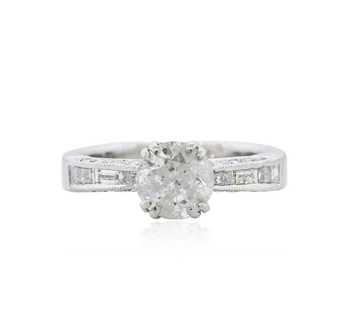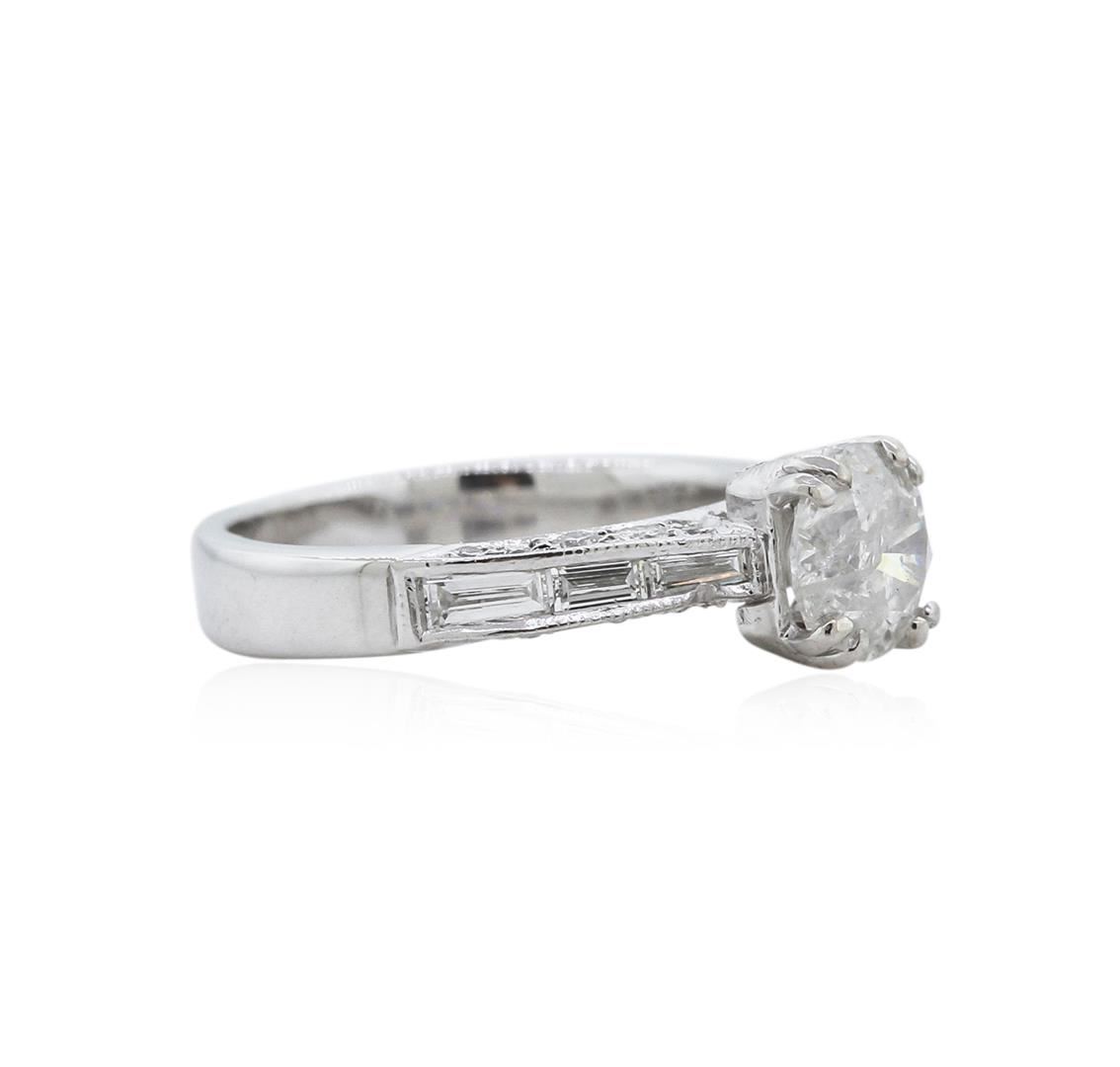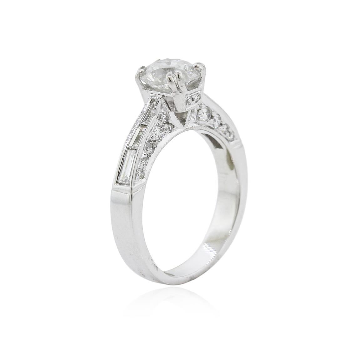 One electronically tested platinum ladies cast diamond engagement ring with a bright polish finish. Identified with markings of "PT 950". Condition is very good. Containing: One prong set round brilliant cut diamond, measuring 6.40 - 6.40 x 4.24mm (depth est.) approximate weight of 1.06ct. Clarity: I-3. Color: I, Cut is Good. Twenty-Eight prong set round brilliant cut diamonds, measuring 1.80 - 1.30 x 0.93mm (depth est.) approximate total weight of 28 Stones = 0.38ct. Clarity: SI-1 to I-1. Color: I - J, Cut is Good. Six prong set baguette cut diamonds, measuring 3.00 x 1.50 x 1.28mm (depth est.) approximate total weight of 6 Stones = 0.20ct. Clarity: SI-1. Color: H - I, Cut is Good. All diamonds are graded in the mounting, unless otherwise stated. Total Weight of Diamonds 1.64ct. Total Weight of Engagement Ring 5.70 grams. GGL Appraised at $6,955.00.