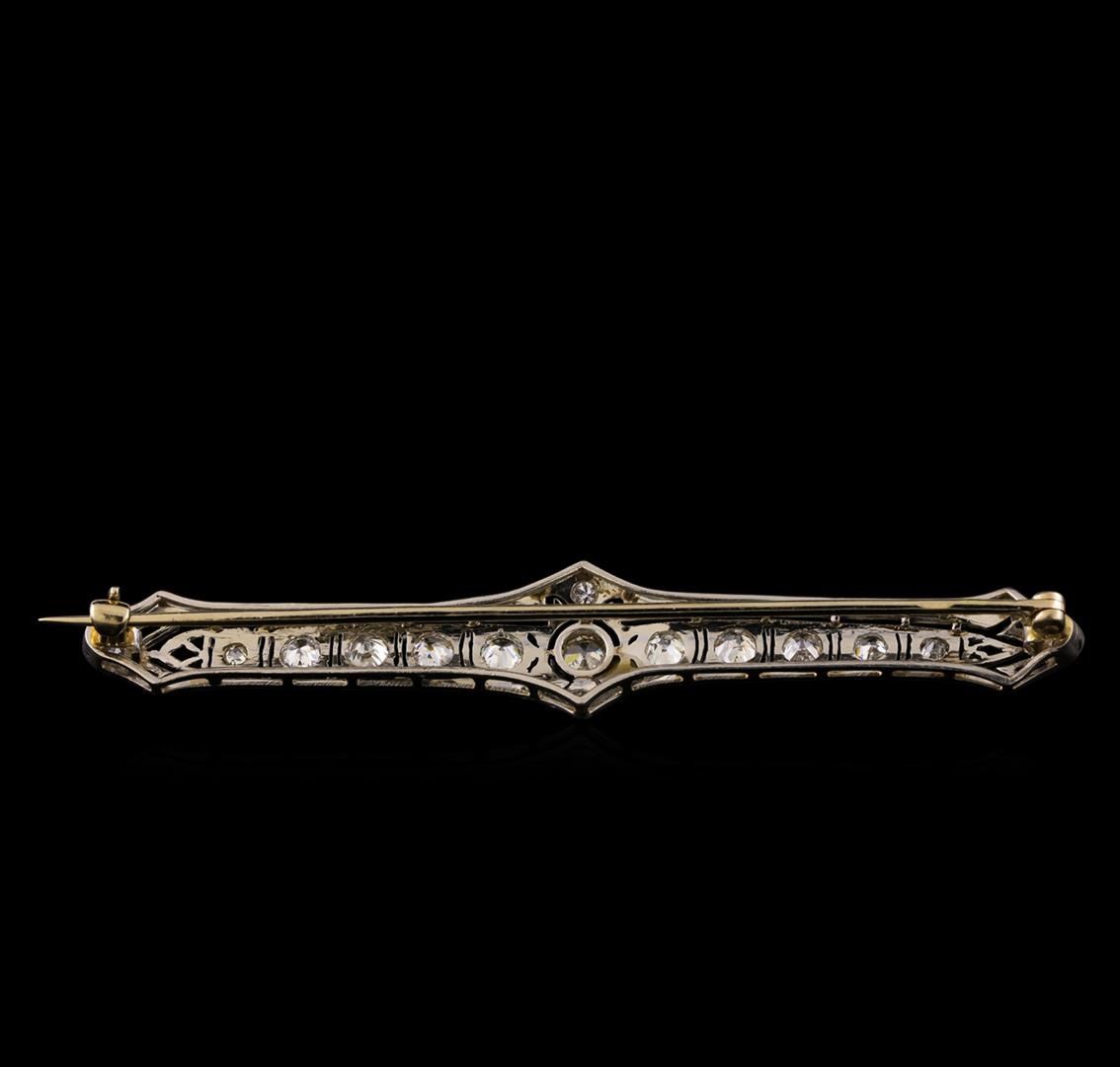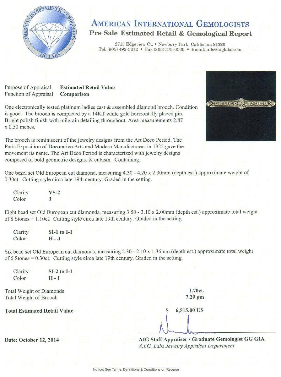 One electronically tested platinum ladies cast & assembled diamond brooch. The brooch is completed by a 14KT white gold horizontally placed pin. Bright polish finish with milgrain detailing throughout. Area measurements 2.87 x 0.50 inches. The brooch is reminiscent of the jewelry designs from the Art Deco Period. The Paris Exposition of Decorative Arts and Modern Manufacturers in 1925 gave the movement its name. The Art Deco Period is characterized with jewelry designs composed of bold geometric designs, & cubism. Condition is good. Containing: One bezel set Old European cut diamond, measuring 4.30 - 4.20 x 2.30mm (depth est.) approximate weight of 0.30ct. Cutting style circa late 19th century. Graded in the setting. Clarity: VS-2. Color: J Eight bead set Old European cut diamonds, measuring 3.50 - 3.10 x 2.00mm (depth est.) approximate total weight of 8 Stones = 1.10ct. Cutting style circa late 19th century. Graded in the setting. Clarity: SI-1 to I-1. Color: H - J Six bead set Old European cut diamonds, measuring 2.30 - 2.10 x 1.36mm (depth est.) approximate total weight of 6 Stones = 0.30ct. Cutting style circa late 19th century. Graded in the setting. Clarity: SI-2 to I-1. Color: H - I. Total Weight of Diamonds 1.70ct. Total Weight of Brooch 7.29 grams. AIG Appraised at $6,515.00.