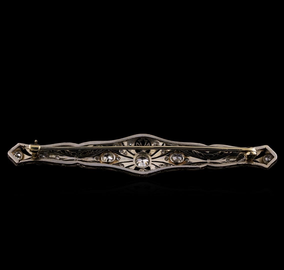 One electronically tested platinum ladies cast & assembled diamond brooch. The brooch is completed by a horizontally placed pin. Bright polish finish with milgrain detailing throughout. Area measurements 2.75 x 0.55 inches. The brooch is reminiscent of the jewelry designs from the Art Deco Period. The Paris Exposition of Decorative Arts and Modern Manufacturers in 1925 gave the movement its name. The Art Deco Period is characterized with jewelry designs composed of bold geometric designs, & cubism. Condition is good. Containing: Three bezel set Old European cut diamonds, measuring 4.30 - 4.20 x 2.20mm (depth est.) approximate total weight of 3 Stones = 0.82ct. Cutting style circa late 19th century. Graded in the setting. Clarity: SI-1 to SI-2. Color: H - I Four bead set Old European cut diamonds, measuring 3.50 - 3.10 x 2.20mm (depth est.) approximate total weight of 4 Stones = 0.68ct. Cutting style circa early and late 19th century. Graded in the setting. Clarity: SI-1 to SI-2. Color: H - I Twenty-Two bead set rose cut diamonds, measuring 1.70 - 1.30 x 0.70mm (depth est.) approximate total weight of 22 Stones = 0.20ct. Graded in the setting. Clarity: SI-1 to I-1. Color: H - I. Total Weight of Diamonds 1.70ct. Total Weight of Brooch 8.46 grams. AIG Appraised at $7,290.00.