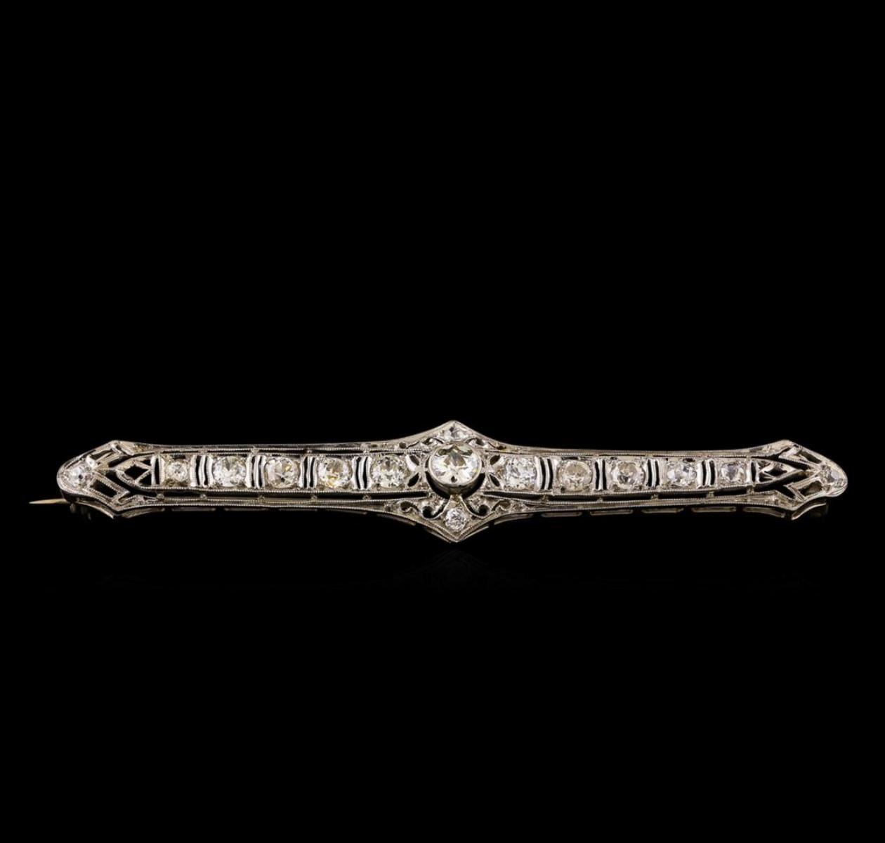 One electronically tested platinum ladies cast & assembled diamond brooch. The brooch is completed by a 14KT white gold horizontally placed pin. Bright polish finish with milgrain detailing throughout. Area measurements 2.87 x 0.50 inches. The brooch is reminiscent of the jewelry designs from the Art Deco Period. The Paris Exposition of Decorative Arts and Modern Manufacturers in 1925 gave the movement its name. The Art Deco Period is characterized with jewelry designs composed of bold geometric designs, & cubism. Condition is good. Containing: One bezel set Old European cut diamond, measuring 4.30 - 4.20 x 2.30mm (depth est.) approximate weight of 0.30ct. Cutting style circa late 19th century. Graded in the setting. Clarity: VS-2. Color: J Eight bead set Old European cut diamonds, measuring 3.50 - 3.10 x 2.00mm (depth est.) approximate total weight of 8 Stones = 1.10ct. Cutting style circa late 19th century. Graded in the setting. Clarity: SI-1 to I-1. Color: H - J Six bead set Old European cut diamonds, measuring 2.30 - 2.10 x 1.36mm (depth est.) approximate total weight of 6 Stones = 0.30ct. Cutting style circa late 19th century. Graded in the setting. Clarity: SI-2 to I-1. Color: H - I. Total Weight of Diamonds 1.70ct. Total Weight of Brooch 7.29 grams. AIG Appraised.