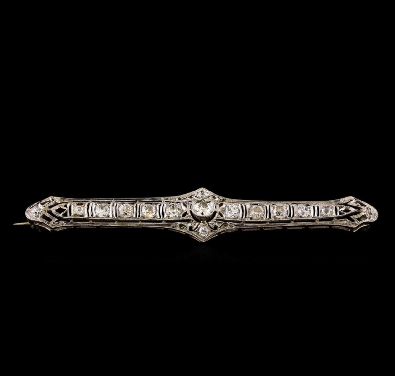 One electronically tested platinum ladies cast & assembled diamond brooch. The brooch is completed by a 14KT white gold horizontally placed pin. Bright polish finish with milgrain detailing throughout. Area measurements 2.87 x 0.50 inches. The brooch is reminiscent of the jewelry designs from the Art Deco Period. The Paris Exposition of Decorative Arts and Modern Manufacturers in 1925 gave the movement its name. The Art Deco Period is characterized with jewelry designs composed of bold geometric designs, & cubism. Condition is good. Containing: One bezel set Old European cut diamond, measuring 4.30 - 4.20 x 2.30mm (depth est.) approximate weight of 0.30 ct. Cutting style circa late 19th century. Graded in the setting. Clarity: VS-2. Color: J Eight bead set Old European cut diamonds, measuring 3.50 - 3.10 x 2.00mm (depth est.) approximate total weight of 8 Stones = 1.10 ct. Cutting style circa late 19th century. Graded in the setting. Clarity: SI-1 to I-1. Color: H - J Six bead set Old European cut diamonds, measuring 2.30 - 2.10 x 1.36mm (depth est.) approximate total weight of 6 Stones = 0.30 ct. Cutting style circa late 19th century. Graded in the setting. Clarity: SI-2 to I-1. Color: H - I. Total Weight of Diamonds 1.70 ct. Total Weight of Brooch 7.29 grams. AIG Appraised.