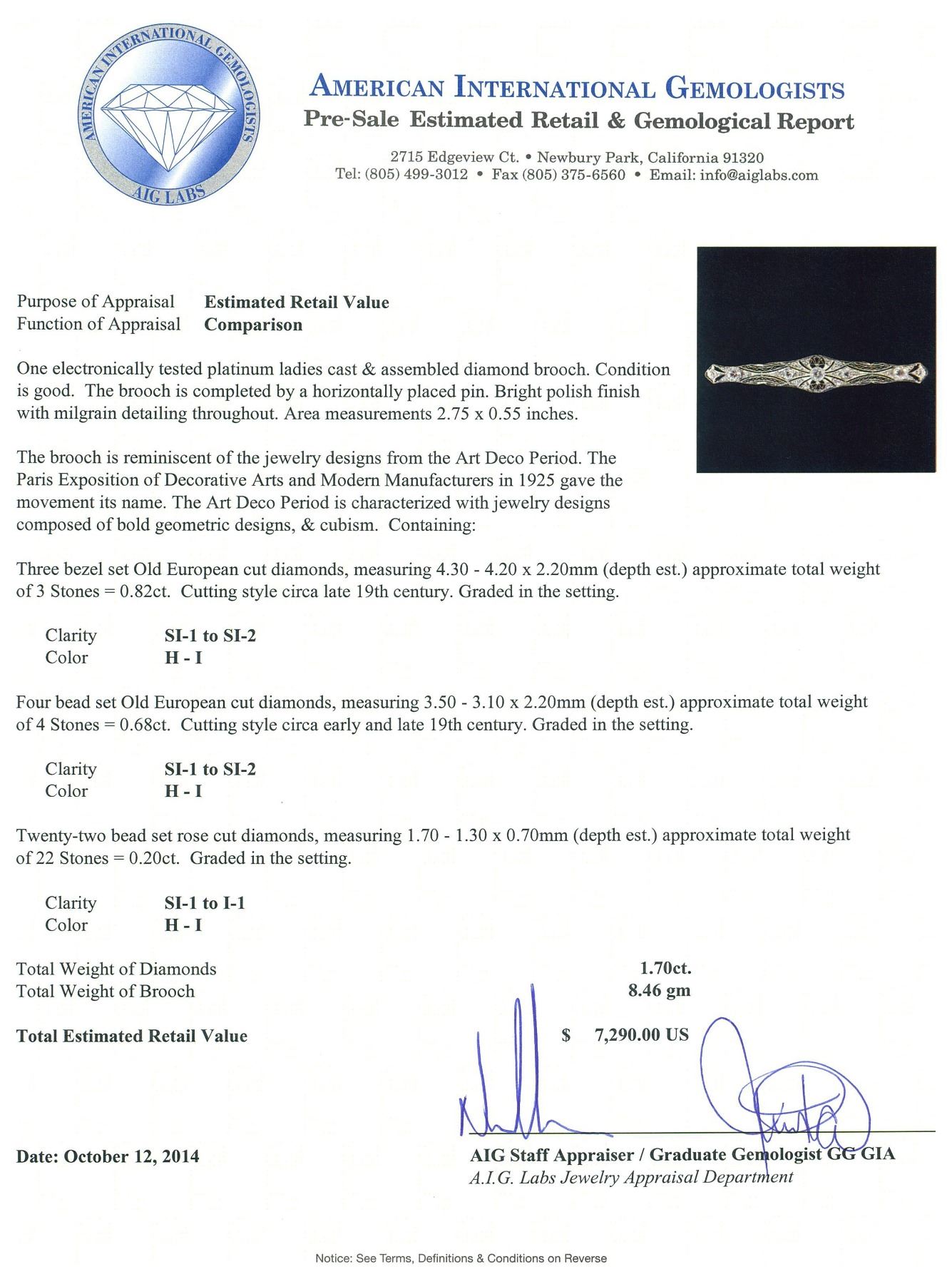One electronically tested platinum ladies cast & assembled diamond brooch. The brooch is completed by a horizontally placed pin. Bright polish finish with milgrain detailing throughout. Area measurements 2.75 x 0.55 inches. The brooch is reminiscent of the jewelry designs from the Art Deco Period. The Paris Exposition of Decorative Arts and Modern Manufacturers in 1925 gave the movement its name. The Art Deco Period is characterized with jewelry designs composed of bold geometric designs, & cubism. Condition is good. Containing: Three bezel set Old European cut diamonds, measuring 4.30 - 4.20 x 2.20mm (depth est.) approximate total weight of 3 Stones = 0.82ct. Cutting style circa late 19th century. Graded in the setting. Clarity: SI-1 to SI-2. Color: H - I Four bead set Old European cut diamonds, measuring 3.50 - 3.10 x 2.20mm (depth est.) approximate total weight of 4 Stones = 0.68ct. Cutting style circa early and late 19th century. Graded in the setting. Clarity: SI-1 to SI-2. Color: H - I Twenty-Two bead set rose cut diamonds, measuring 1.70 - 1.30 x 0.70mm (depth est.) approximate total weight of 22 Stones = 0.20 ct. Graded in the setting. Clarity: SI-1 to I-1. Color: H - I. Total Weight of Diamonds 1.70 ct. Total Weight of Brooch 8.46 grams. AIG Appraised.